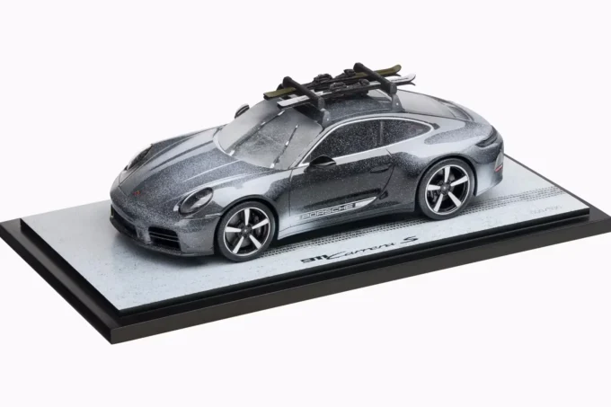 This 1:18 scale Porsche 911 Carrera S (992.2) Xmas 2025 celebrates the holidays with a black finish enhanced by snow effects and skis on the roof. Manufactured in resin by Spark, this limited edition of 500 pieces is presented on a snow-covered base with display case, creating a unique winter scene. This atypical model captures the festive spirit of the season with its original staging that breaks from the usual standards of collectible miniatures.