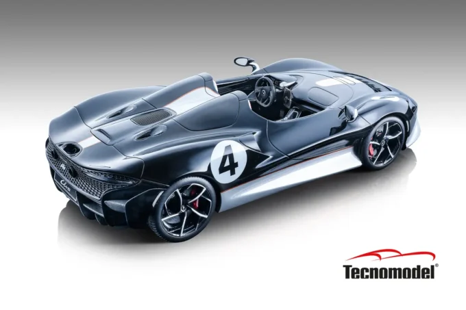 This 1:18th scale miniature car reproduces the McLaren Elva in a black color. Manufactured by Tecnomodel, this scale model is made of resin and comes with a transparent display case. Miniature produced in a limited series of only 79 copies.