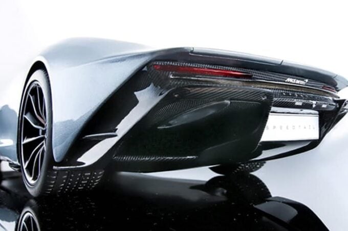 Limited to 99 pieces and delivered in a display case, this premium model car reproduces the McLaren Speedtail at 1:18 scale in its light blue livery.