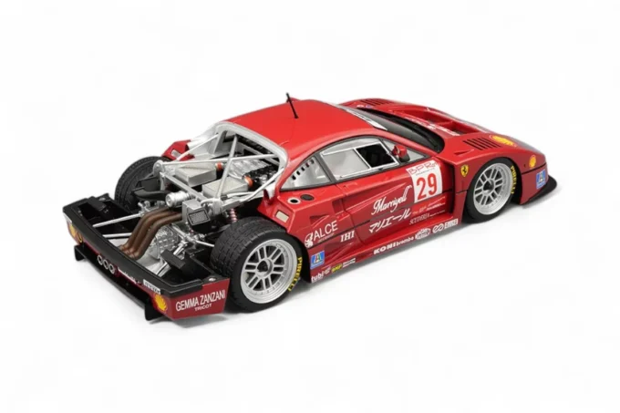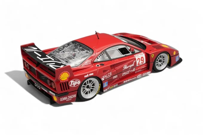The 1:18 scale Ferrari F40 LM #29 in its red Ennea/Ferrari Club Italia livery from the 1996 Suzuka 1000km. This resin creation by Tecnomodel includes the opening rear hood revealing the engine. The BPR championship allowed the F40 to extend its sporting career even though production of the road car had ceased in 1992. This limited series miniature, supplied with base and display case, honors the Angelelli/Oota crew.