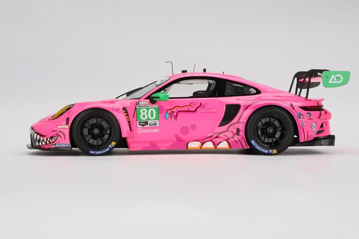 The Porsche 911 (992) GT3-R "Roxy" in its pink AO Racing livery, famous for its dinosaur livery and participation in the 2023 Michelin GT Challenge, is beautifully recreated by TopSpeed in 1:18 scale. This resin model stands out with its meticulous details and distinctive look. Known for its striking livery, "Roxy" left a lasting impression on the track, making this scale model even more special. Limited edition, this piece is a must-have for collectors.