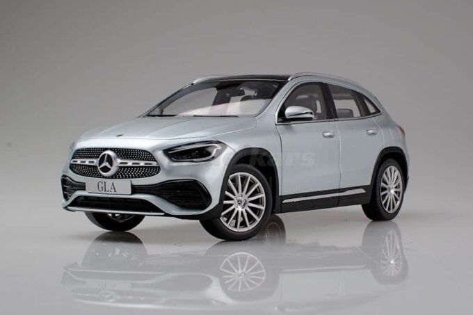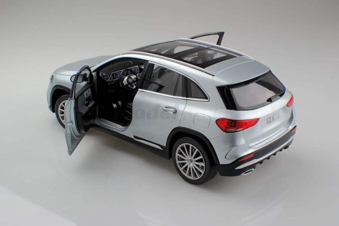 The Mercedes-Benz GLA is an SUV here reproduced in 1:18 scale by Z Models in a silver livery. This model, which has opening doors and directional wheels, is an official Mercedes-Benz product.