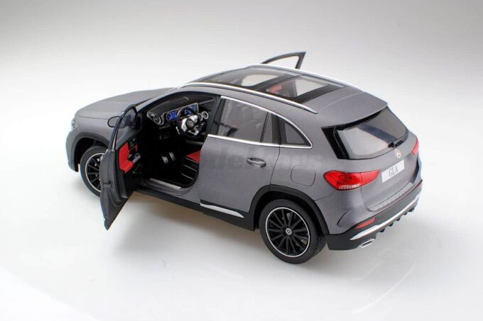The Mercedes-Benz GLA is an SUV here reproduced at 1:18 scale by Z Models in a matte gray livery. This model, which has opening doors and directional wheels, is an official Mercedes-Benz product.