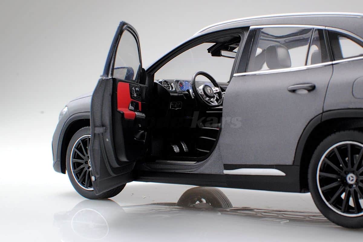 The Mercedes-Benz GLA is an SUV here reproduced at 1:18 scale by Z Models in a matte gray livery. This model, which has opening doors and directional wheels, is an official Mercedes-Benz product.