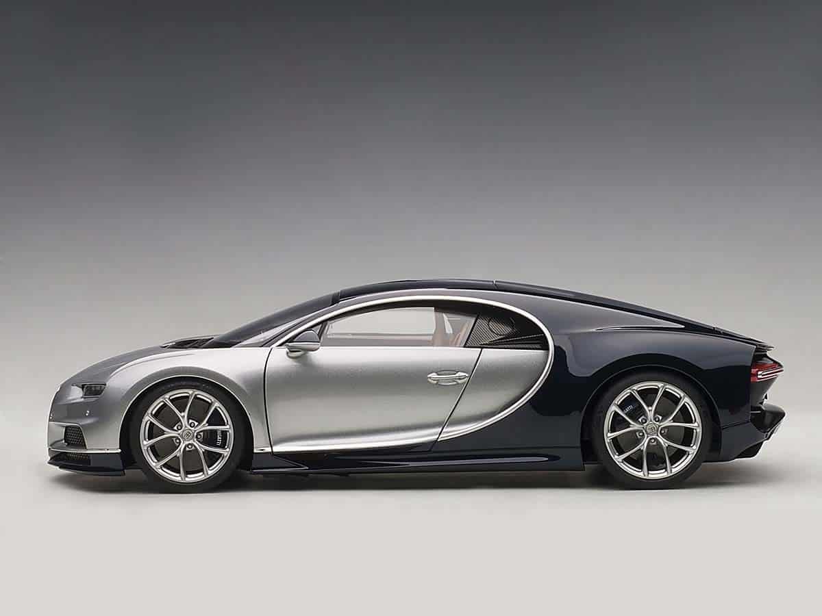 D’une qualité de finition exceptionnelle, cette Bugatti Chiron est fabriquée à l’échelle 1:18 par AUTOart dans une livrée argent et bleue. Cette miniature possède les roues directionnelles et un aileron mobile. Les portes sont ouvrables tout comme le coffre ainsi que le capot moteur qui peut être retiré.
