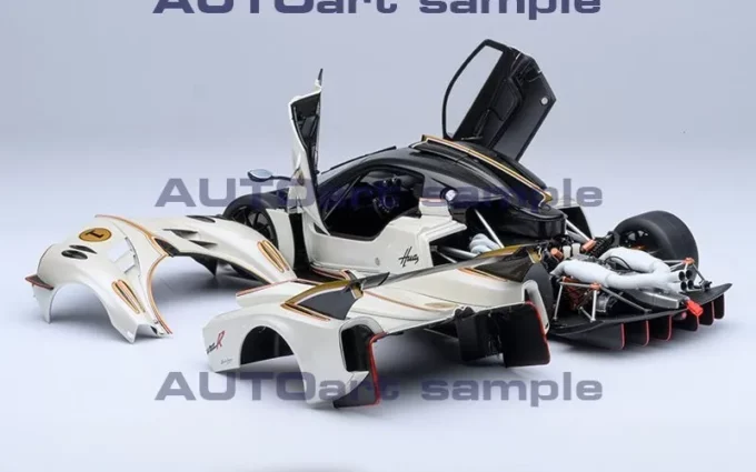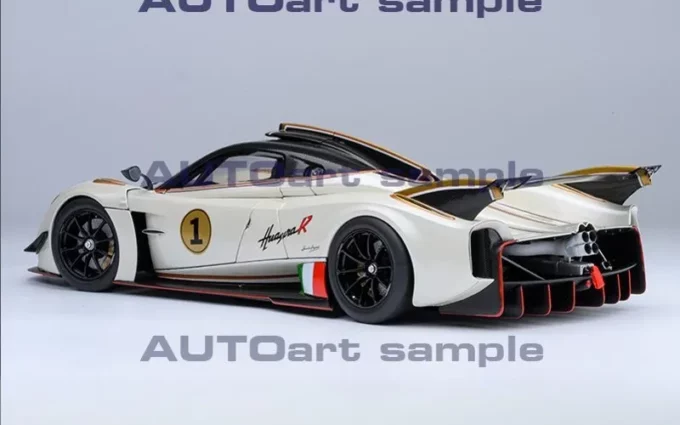 Cette voiture miniature à l'échelle 1:18ème reproduit la Pagani Huayra R dans un coloris blanc Benni. Elle porte le numéro #1. Fabriqué par AUTOart, ce modèle réduit est réalisé en composite. Certaines parties sont ouvrantes.
