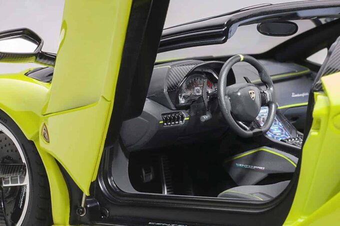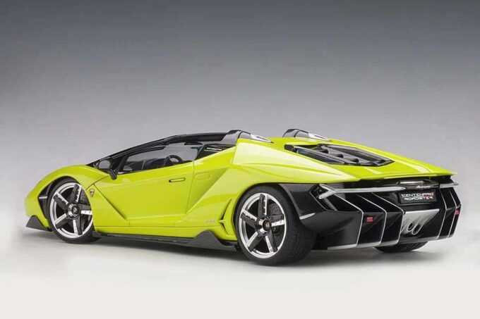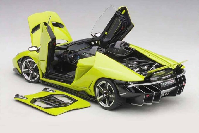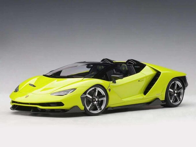 Cette hypercar a été présentée en 2016 à l'occasion du centième anniversaire du fondateur de la marque, Ferruccio Lamborghini. Avec 770 chevaux et une vitesse de pointe de 350 km/h annoncée, c'est l'une des Lamborghini les plus impressionnantes ! Elle est ici reproduite dans sa version Roadster en vert « Verde Scandal » dans ses moindre détails par le fabricant AUTOart à l'échelle 1:18ème. De nombreux ouvrants et pièces mobiles sont présents : portes, coffre, capot et roues directionnelles et aileron rétractable.