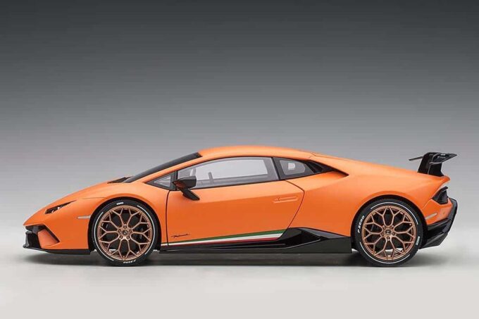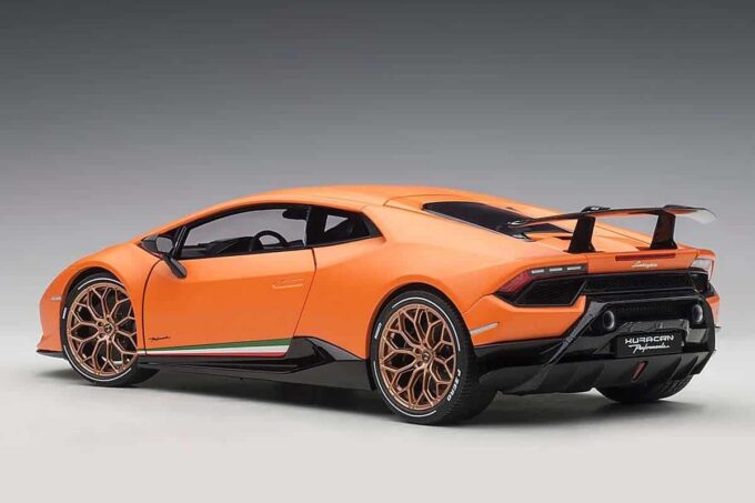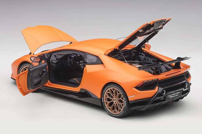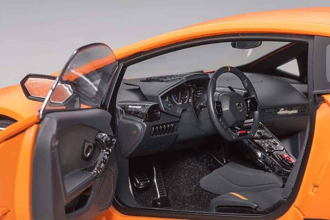Cette Huracan est taillée pour battre des records en piste grâce à son poids contenu et ses éléments aérodynamiques qui s'ajustent au profil du circuit. Reproduite en orange matte dans ses moindres détails à l'échelle 1:18, cette Lamborghini Huracan Performante est une miniature haut de gamme conçue par AUTOart et possède de nombreux ouvrants : portes, capot, coffre ainsi que les roues directrices.