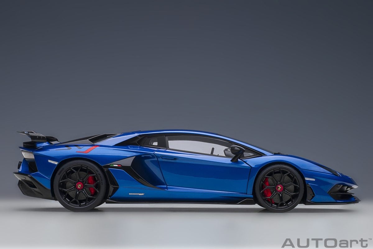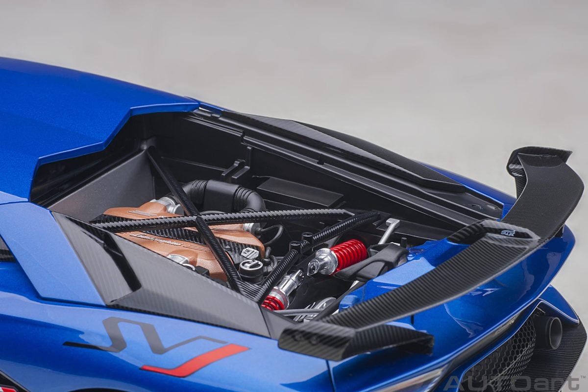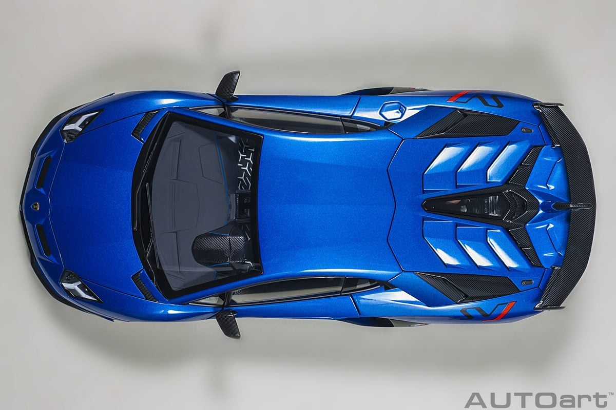 Cette Lamborghini Aventador SVJ est reproduite à la perfection au 1:18ème par AUTOart dans une livrée bleue Nethuns. Ce modèle comporte de nombreux ouvrants permettant d'admirer l'intérieur, le coffre ainsi que le moteur.