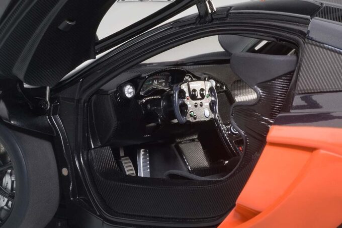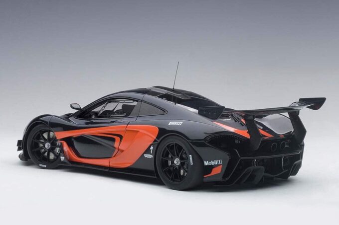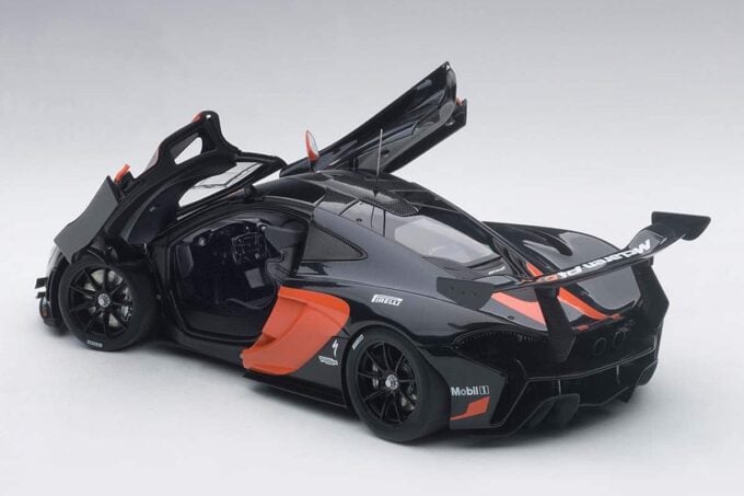 Ce modèle réduit au 1:18 fabriqué par AUTOart reproduit avec fidélité les courbes de la McLaren P1 GTR dans sa livrée noire et orange. Cette miniature possède des ouvrants vous permettant d'apprécier l'intérieur tout en carbone. Basée sur la P1, cette voiture présentée en 2015 est dédiée uniquement au circuit. Sa puissance de 1000 chevaux pour seulement 1300 kg en font la digne héritière de la McLaren F1 GTR !