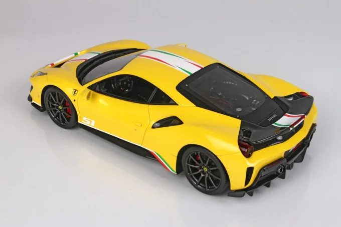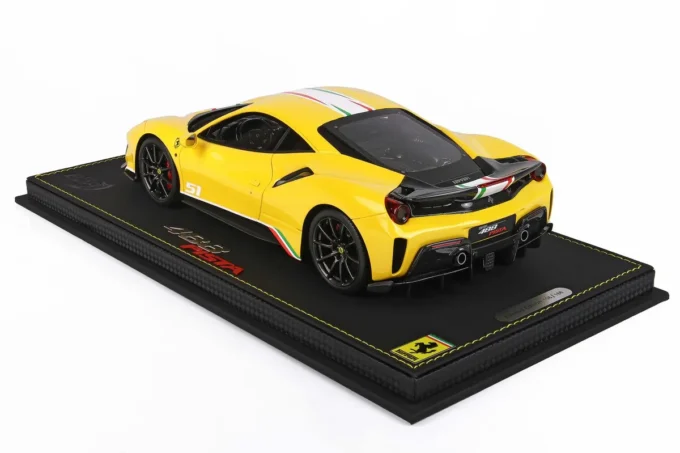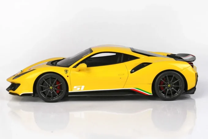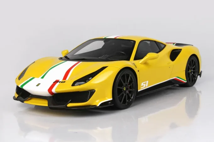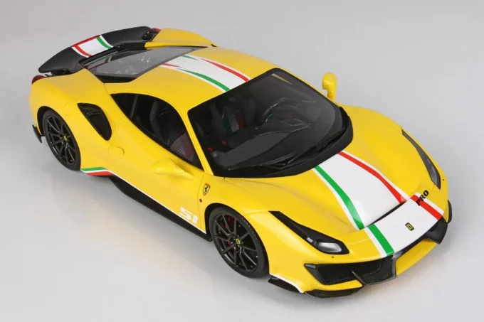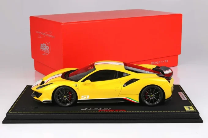 Ce modèle réduit haut de gamme reproduit la Ferrari 488 Pista Piloti dans une réplique extrêmement fidèle. De couleur jaune Modena, cette miniature est fabriquée par BBR à l’échelle 1:18ème et livrée sur un support de qualité incluant une vitrine. Modèle limité à 168 pièces numérotées.