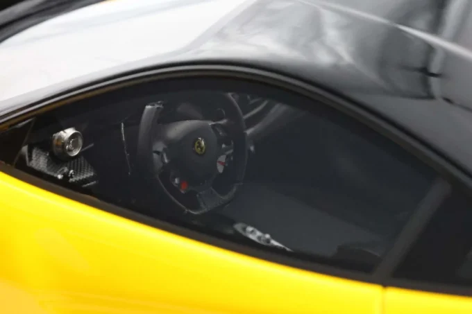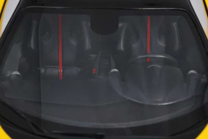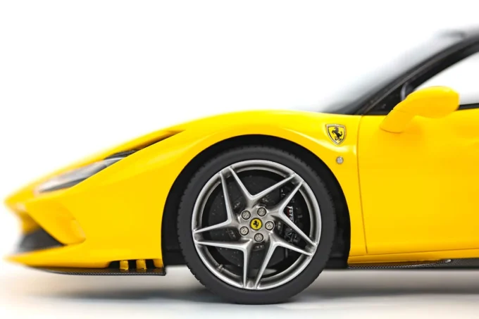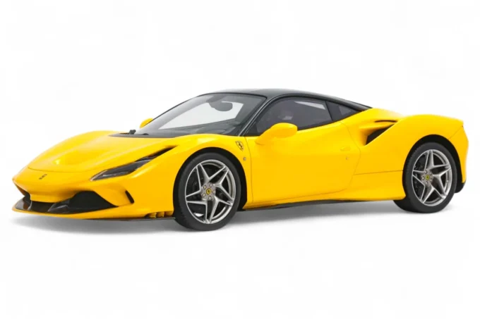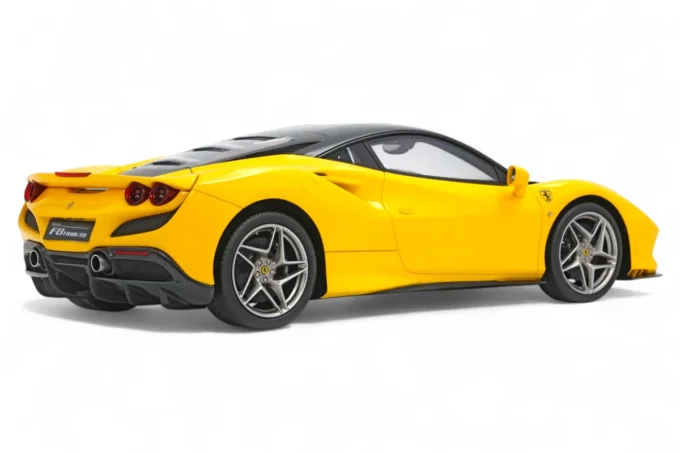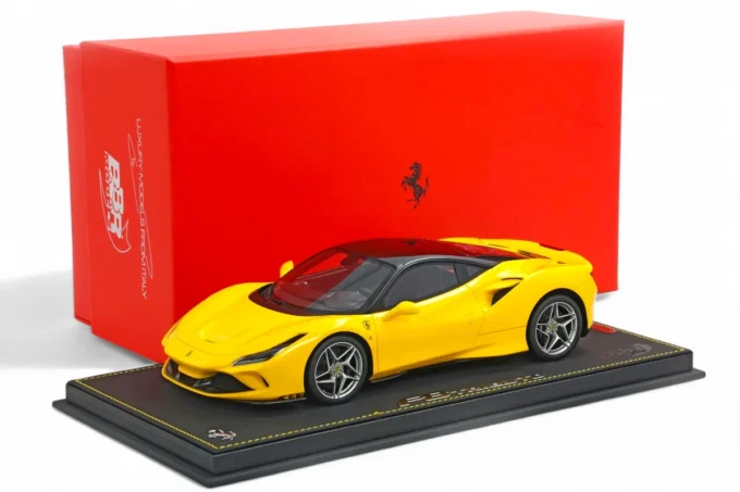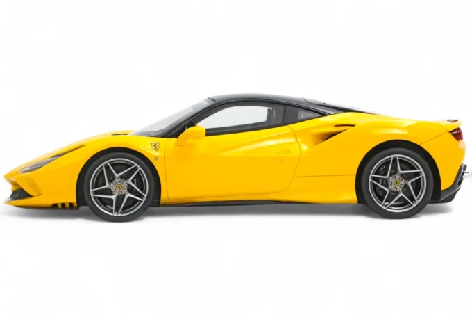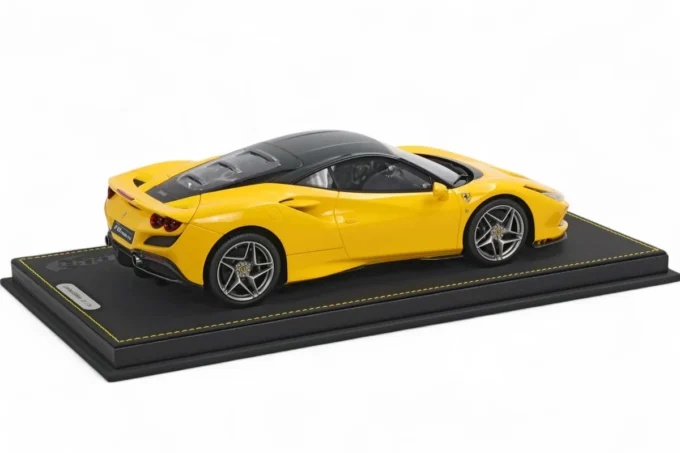 Cette Ferrari F8 Tributo à l'échelle 1:18 présente une carrosserie jaune Modena contrastant avec son toit noir. Produite en résine par BBR et limitée à 24 exemplaires, elle repose sur un socle en similicuir. Cette combinaison bicolore accentue la silhouette élancée du coupé italien. La F8 Tributo délivre 720 chevaux et accélère de 0 à 100 km/h en seulement 2,9 secondes.