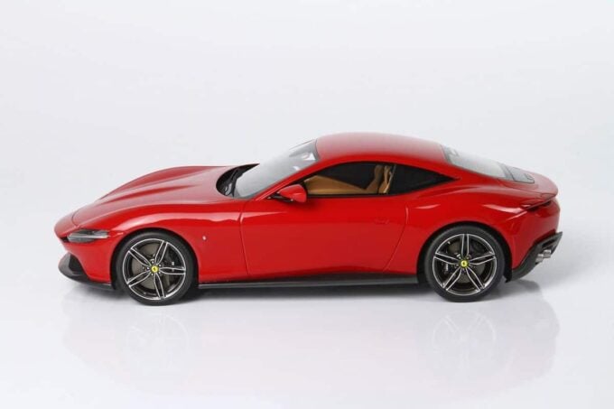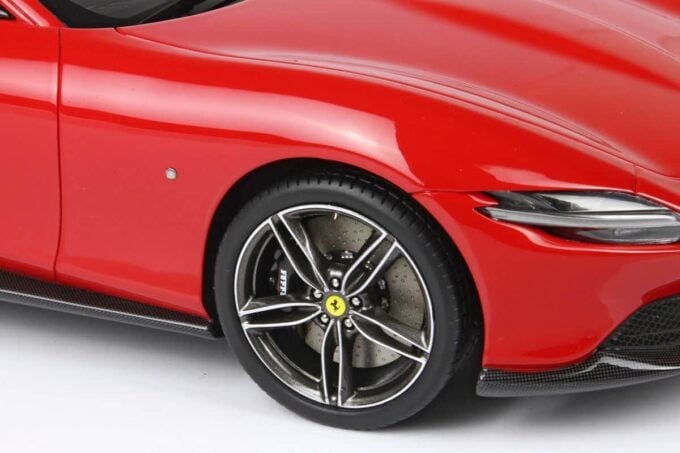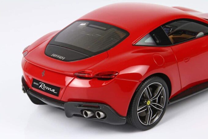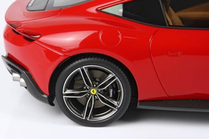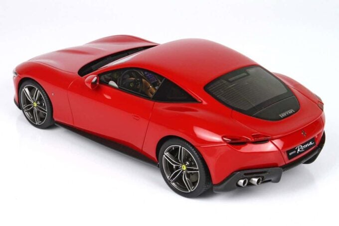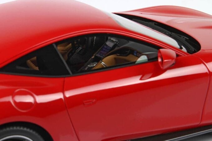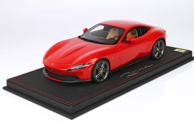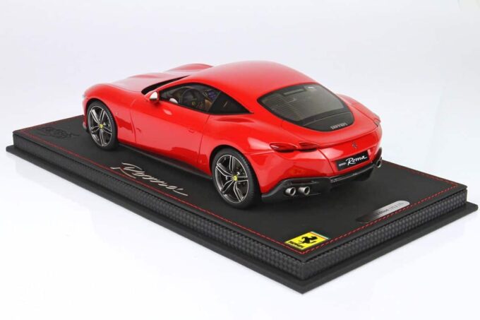 Cette Ferrari Roma est fabriquée par BBR, spécialiste des voitures miniatures haut de gamme. Modélisée à l'échelle 1:18ème jusque dans ses moindres détails, elle est ici présentée dans une livrée rouge Corsa 322.