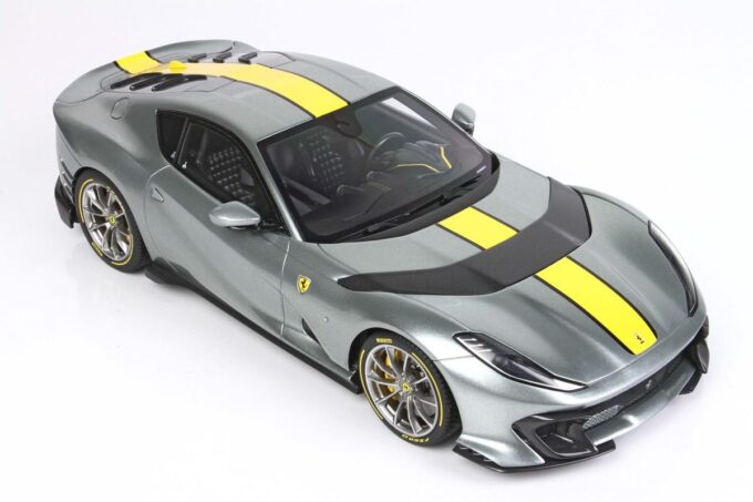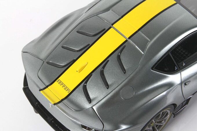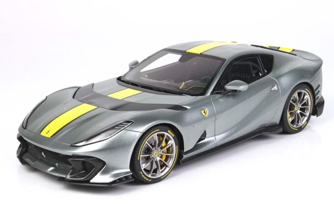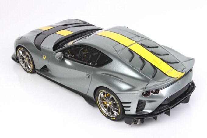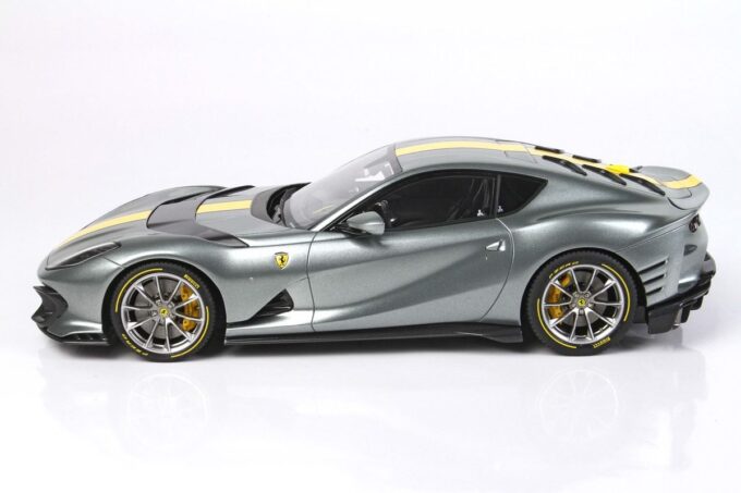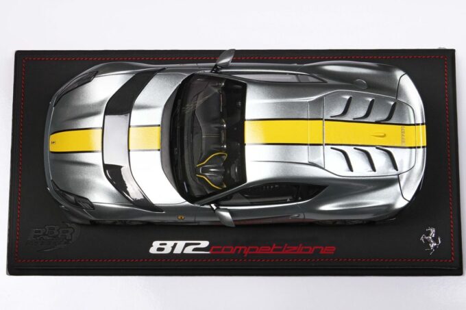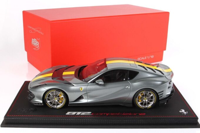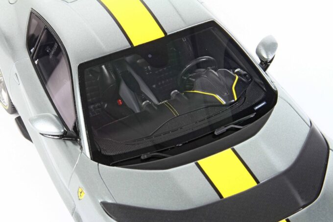 Cette voiture miniature à l’échelle 1:18 reproduit avec une précision exceptionnelle la Ferrari 812 Competizione dans une livrée gris Coburn et bande jaune. Cette voiture est présentée sur un socle haut de gamme et livrée sans vitrine.