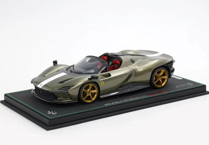 Cette voiture miniature à l'échelle 1:18ème reproduit la Ferrari Daytona SP3 dans un coloris vert Manzoni / bande blanche (toit ouvert). Fabriqué par BBR, ce modèle réduit est réalisé en résine. Miniature produite en série limitée à 24 exemplaires numérotés.
