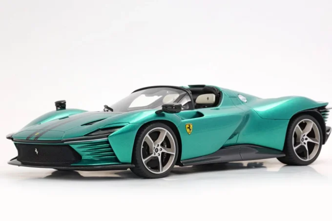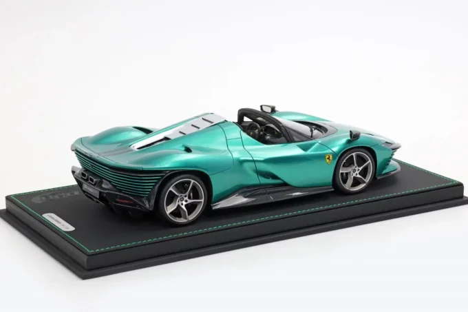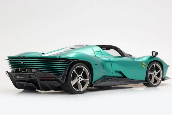 Cette voiture miniature à l'échelle 1:18ème reproduit la Ferrari Daytona SP3 dans un coloris vert Jewel et bandes noires (toit ouvert). Fabriqué par BBR, ce modèle réduit est réalisé en résine. Miniature produite en série limitée à 24 pièces numérotées.
