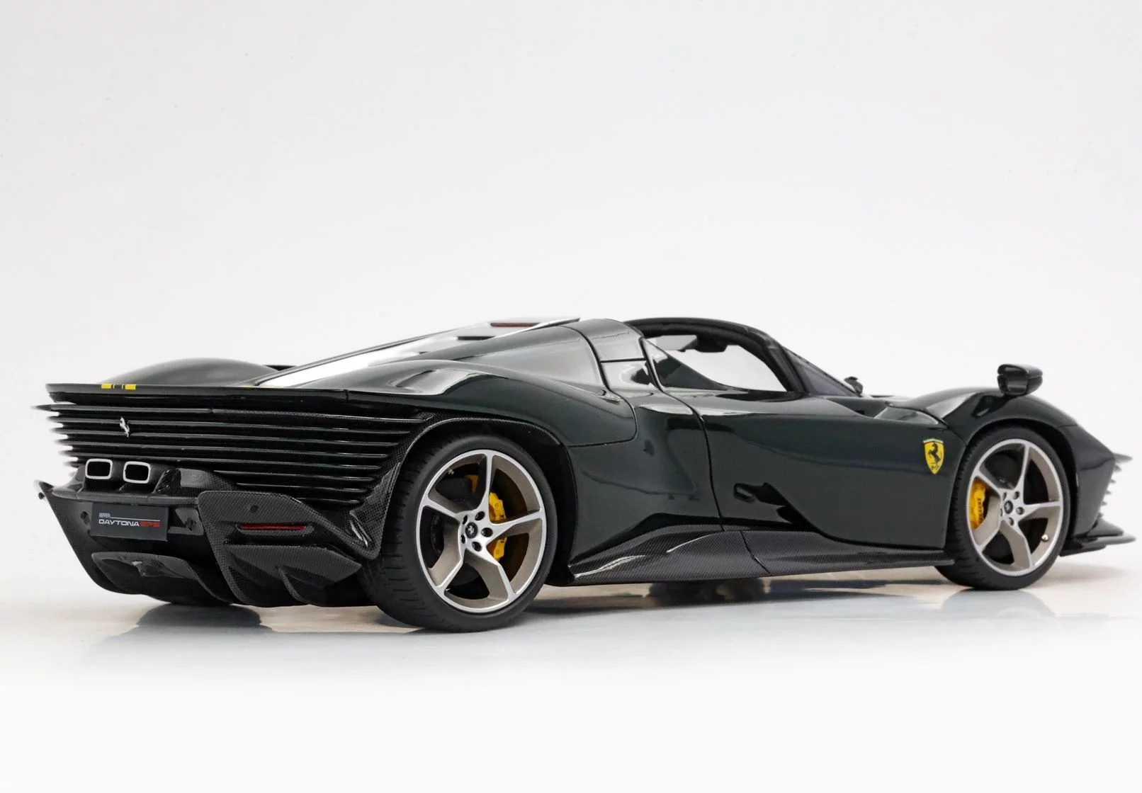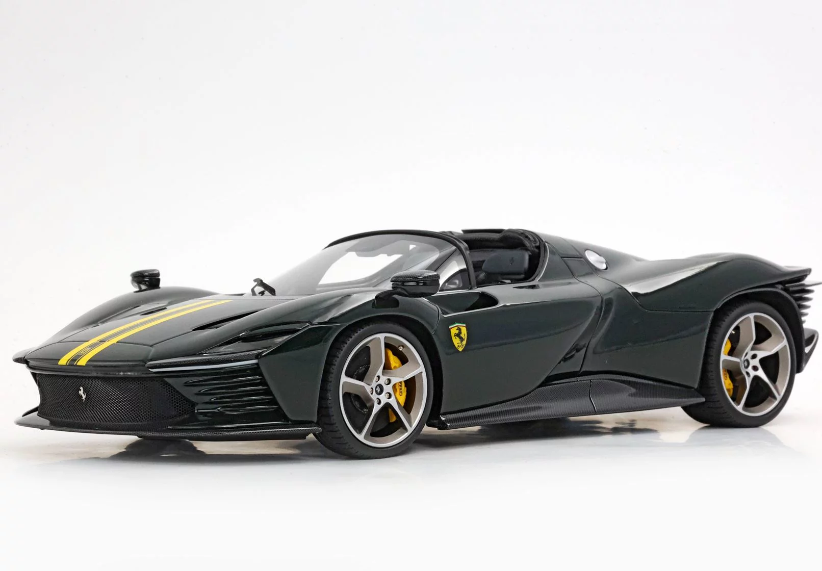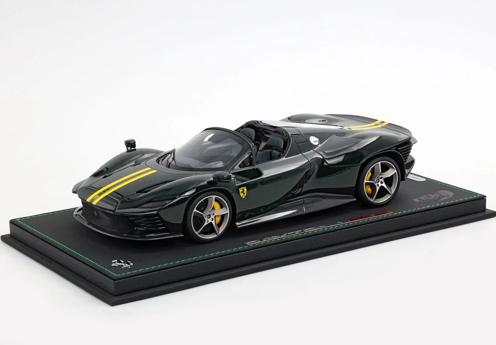 Cette voiture miniature à l'échelle 1:18ème reproduit la Ferrari Daytona SP3 dans un coloris vert British et bandes jaunes (toit ouvert). Fabriqué par BBR, ce modèle réduit est réalisé en résine. Miniature produite en série limitée à 24 pièces numérotées.