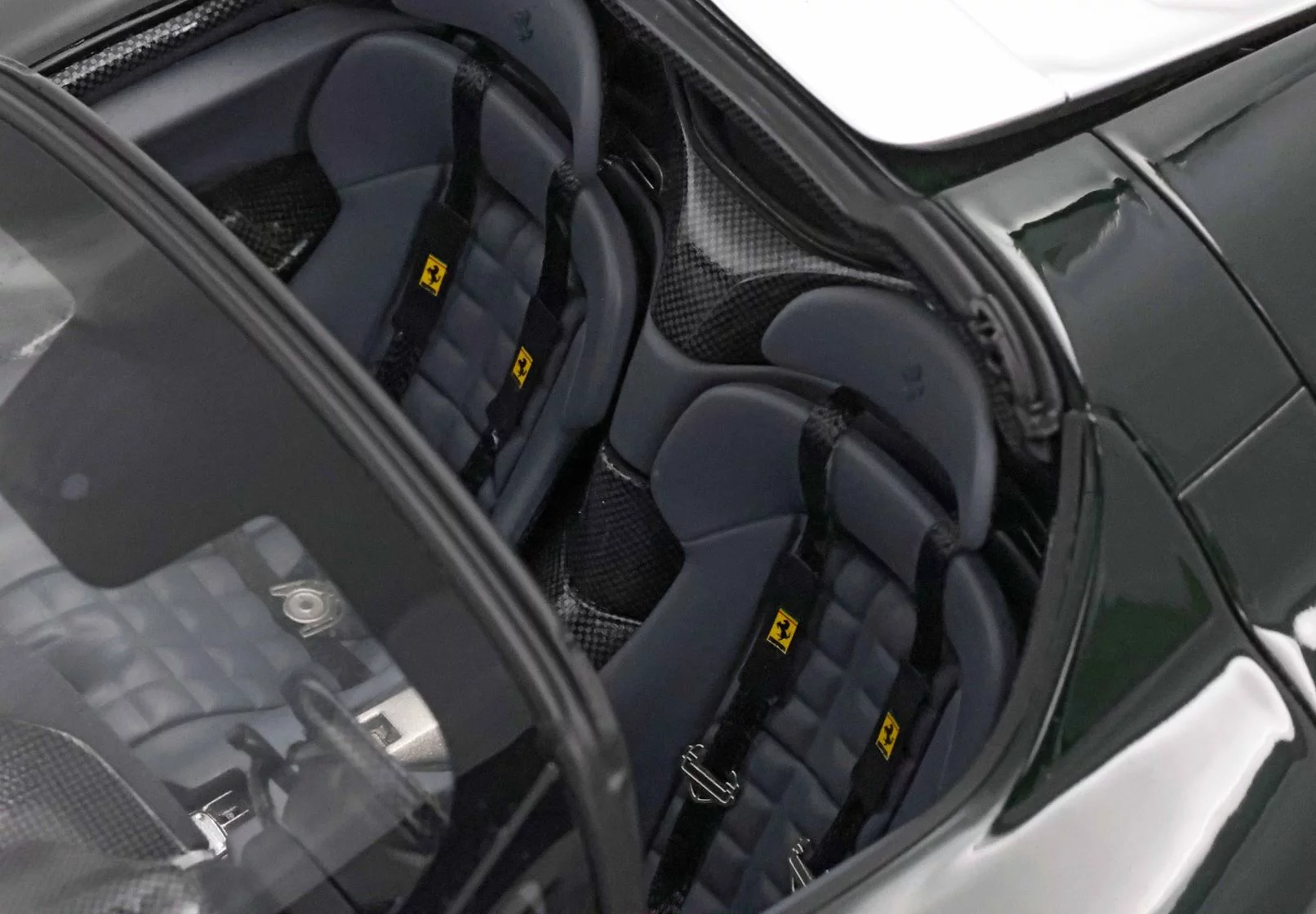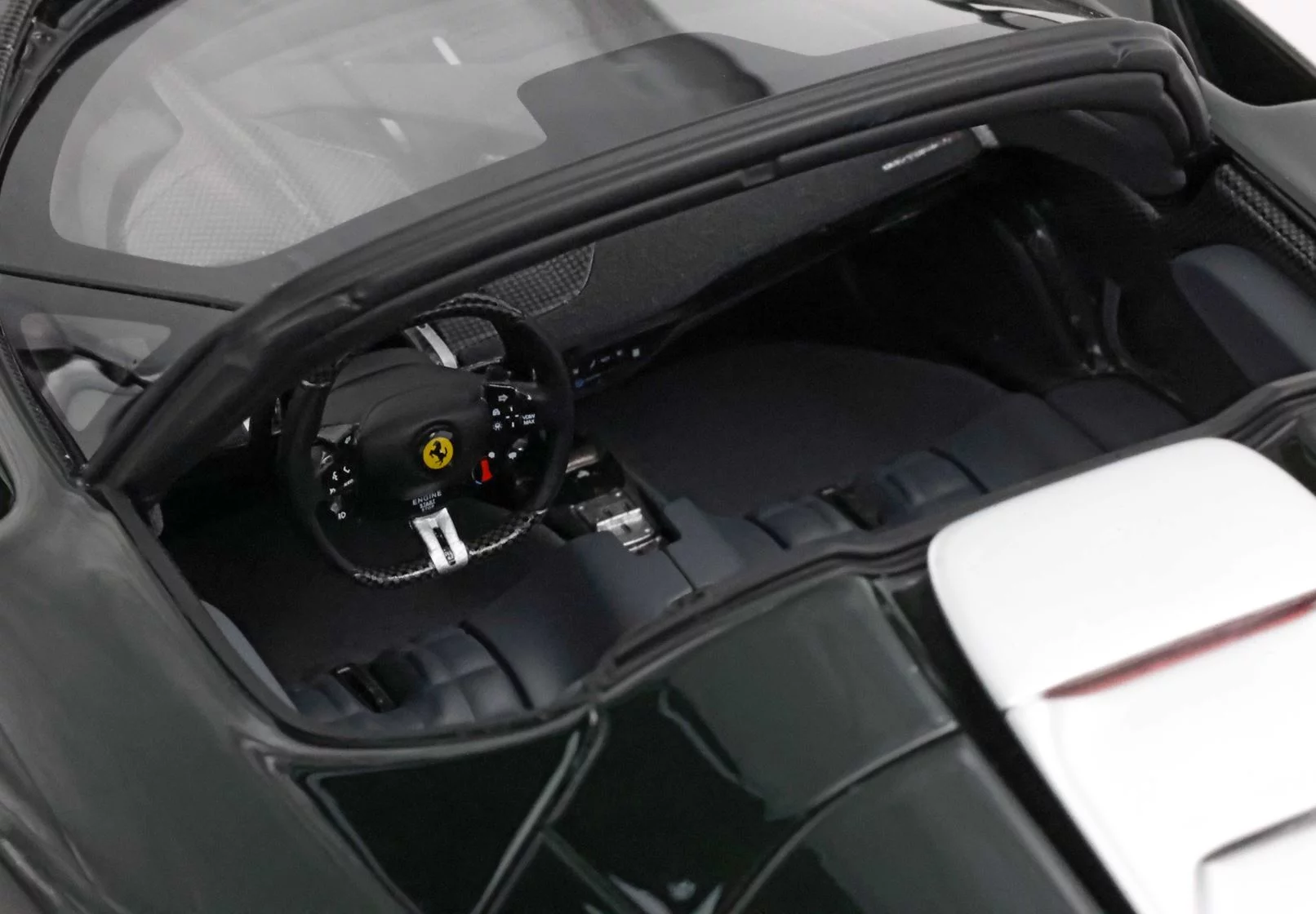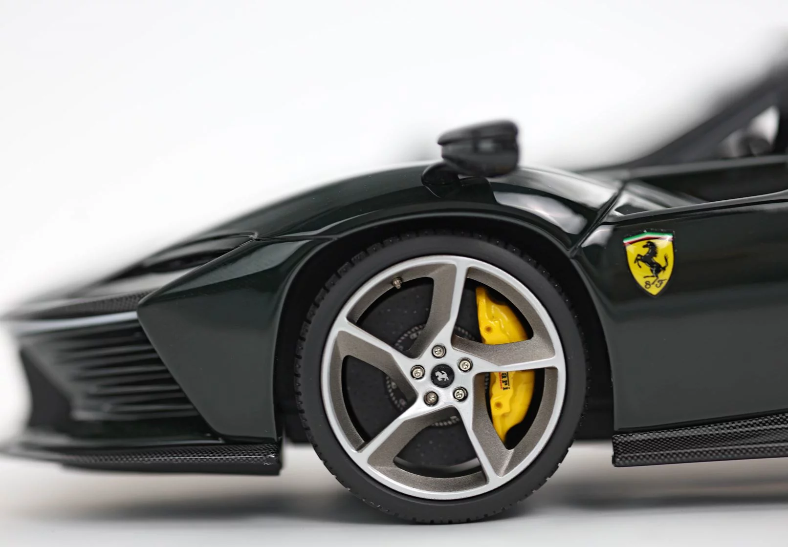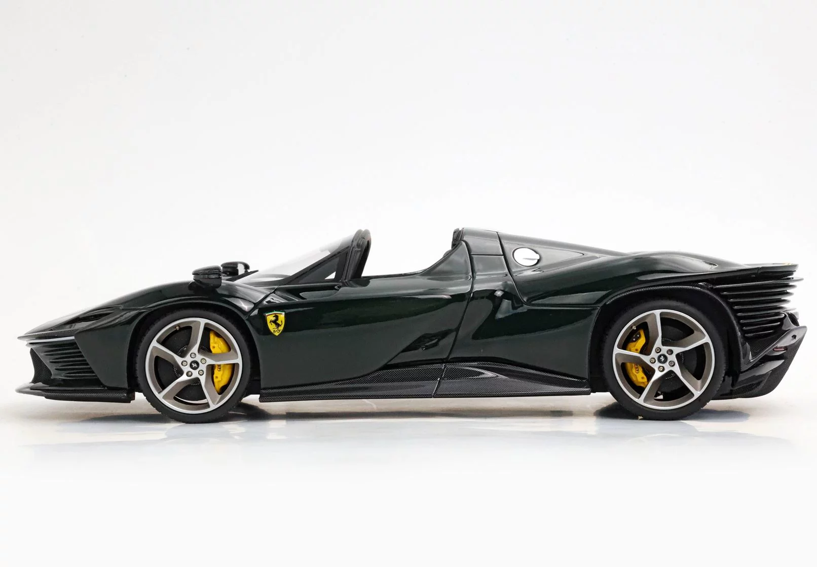 Cette voiture miniature à l'échelle 1:18ème reproduit la Ferrari Daytona SP3 dans un coloris vert British et bandes jaunes (toit ouvert). Fabriqué par BBR, ce modèle réduit est réalisé en résine. Miniature produite en série limitée à 24 pièces numérotées.