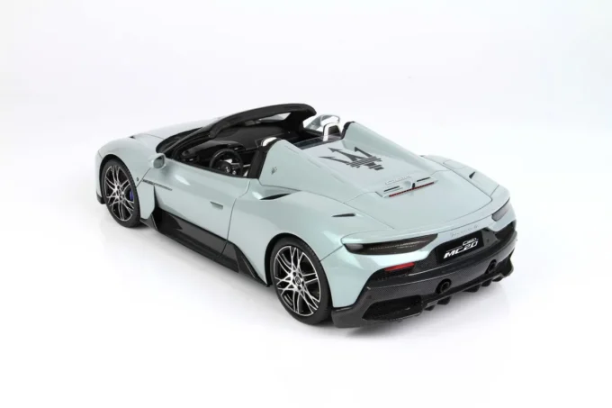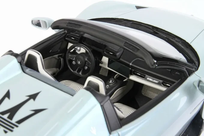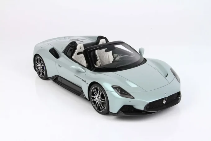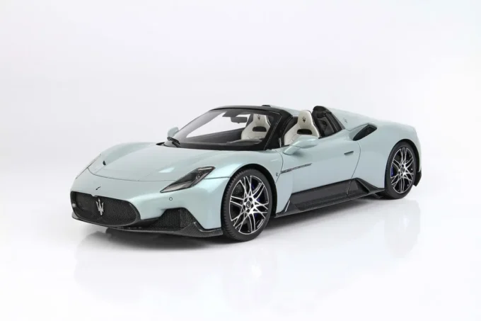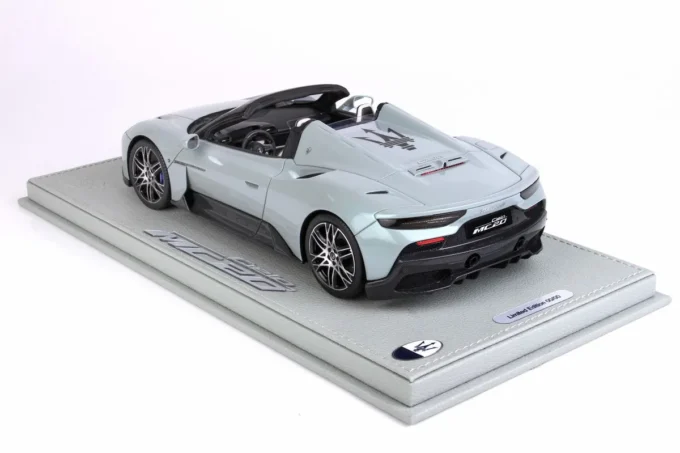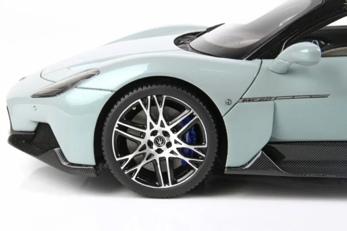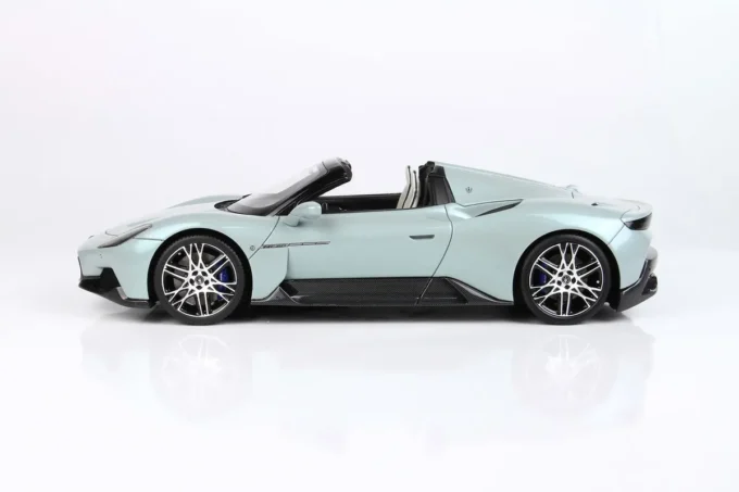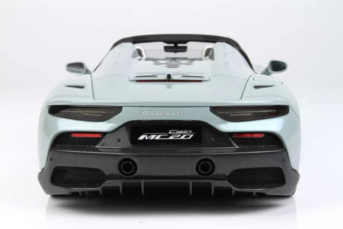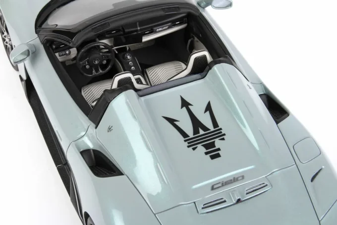 Reproduite à l’échelle 1/18 jusque dans ses moindre détails et livrée sur un socle haut de gamme, ce modèle réduit de la Maserati MC20 Cielo dans sa couleur unique Aqua Marina est fabriqué par BBR et limité à seulement 250 pièces numérotées.