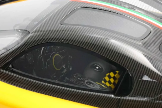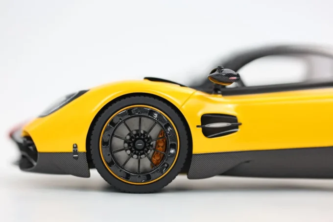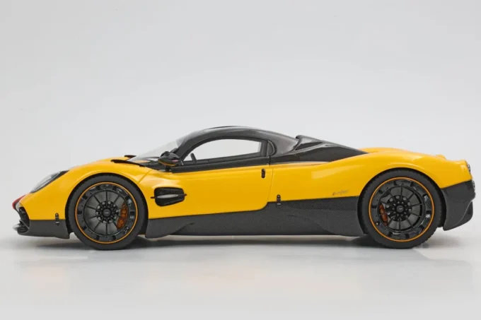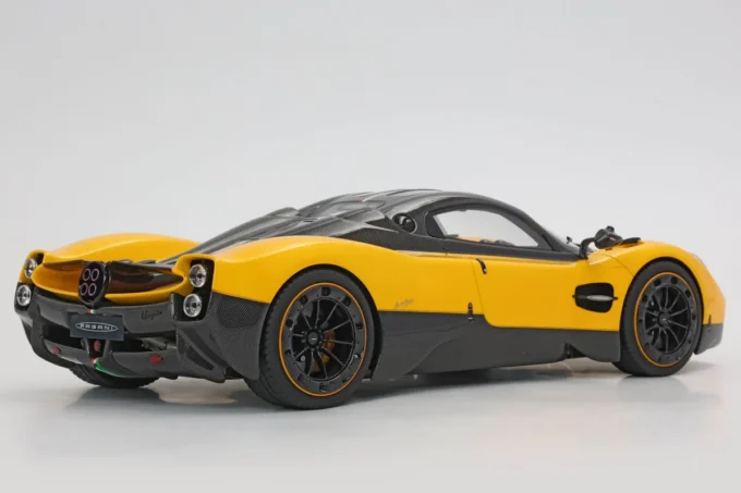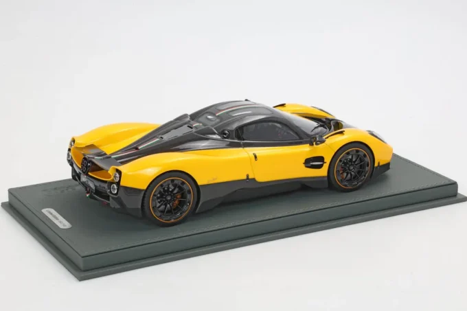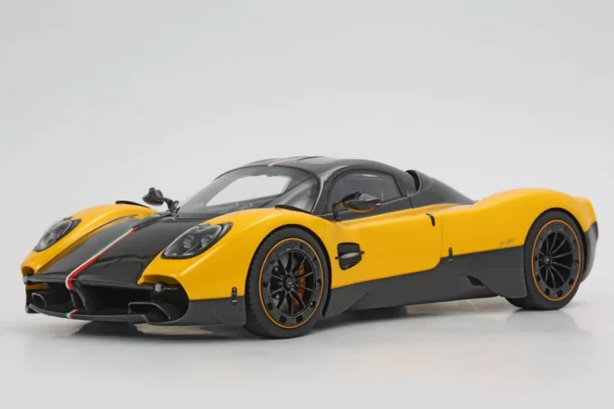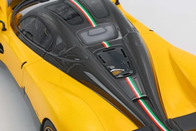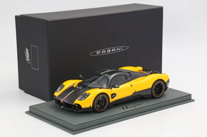 La Pagani Utopia à l'échelle 1:18, fabriquée en résine par BBR, se distingue par sa teinte jaune Ginevra et carbone, avec une bande tricolore aux couleurs du drapeau iranien. En édition limitée à 100 exemplaires, cette miniature est livrée avec un socle. L'Utopia incarne l'essence même de l'innovation et du design exclusif de Pagani, mariant performances exceptionnelles et esthétique raffinée.