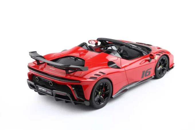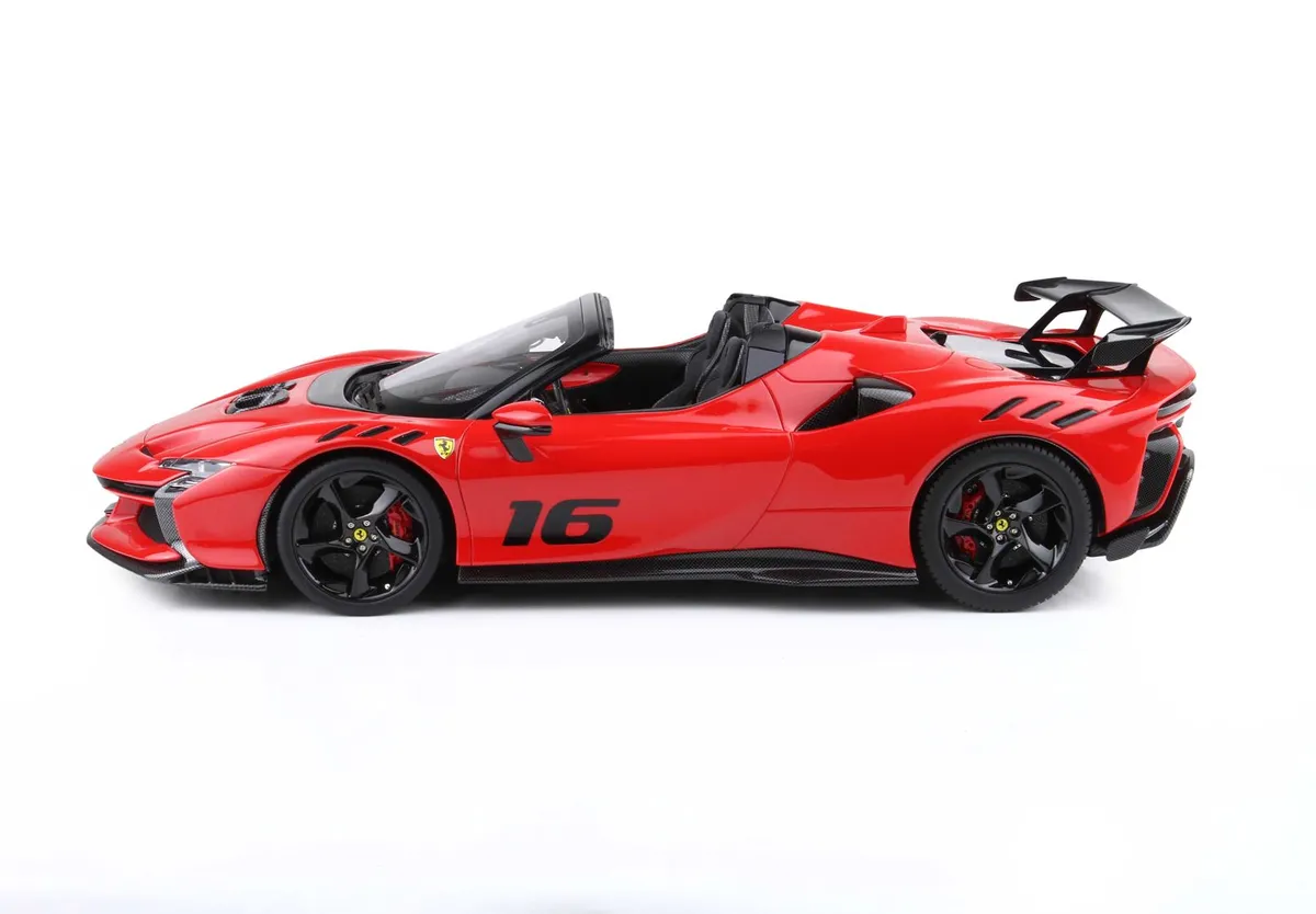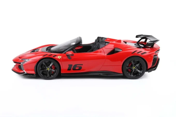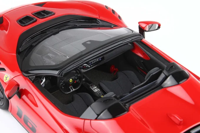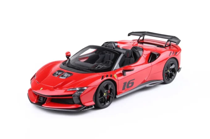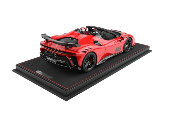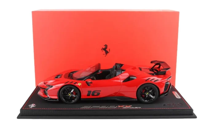 La Ferrari SF90 XX Spider à l'échelle 1:18, réalisée en résine par BBR, arbore une livrée rouge Corsa avec des détails noirs saisissants et le numéro 16. Produite en seulement 50 exemplaires, cette série limitée repose sur un socle raffiné. Le modèle original, un chef-d'œuvre aérodynamique, repousse les limites de la vitesse dans la gamme Ferrari.