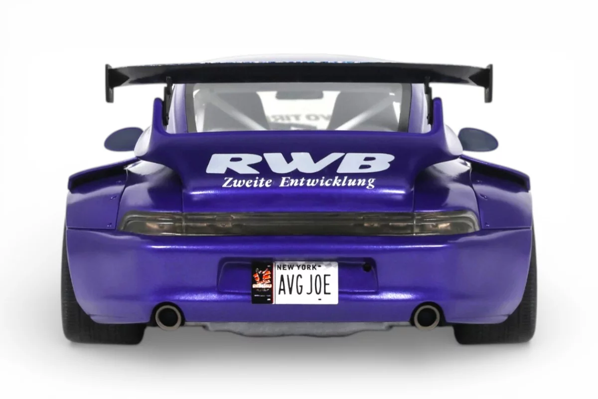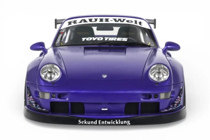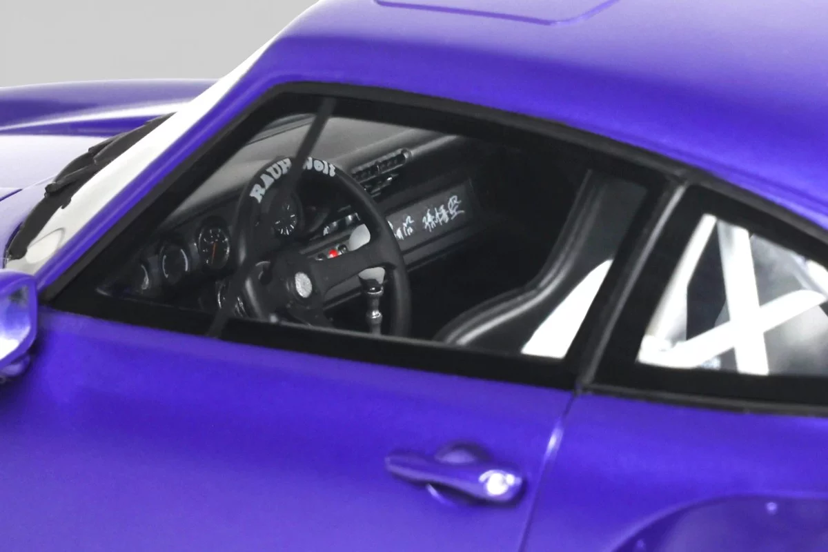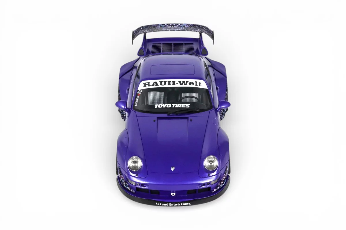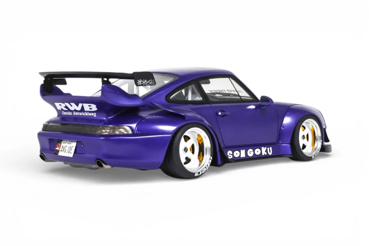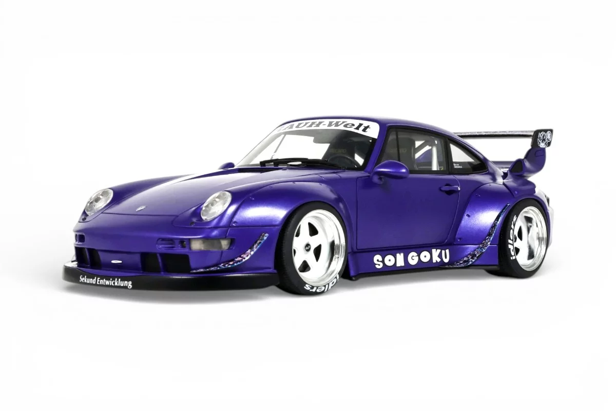 Cette Porsche 911 RWB Son Goku à l'échelle 1:18 est reproduite par GT Spirit en résine dans un coloris violet. RWB (Rauh-Welt Begriff) est l'atelier japonais d'Akira Nakai, connu pour ses kits de carrosserie évasés façonnés et ajustés à la main sur base Porsche 911. Son Goku, figure centrale de Dragon Ball, prête son nom à cette création en 2024. Modèle en série limitée, sur socle.