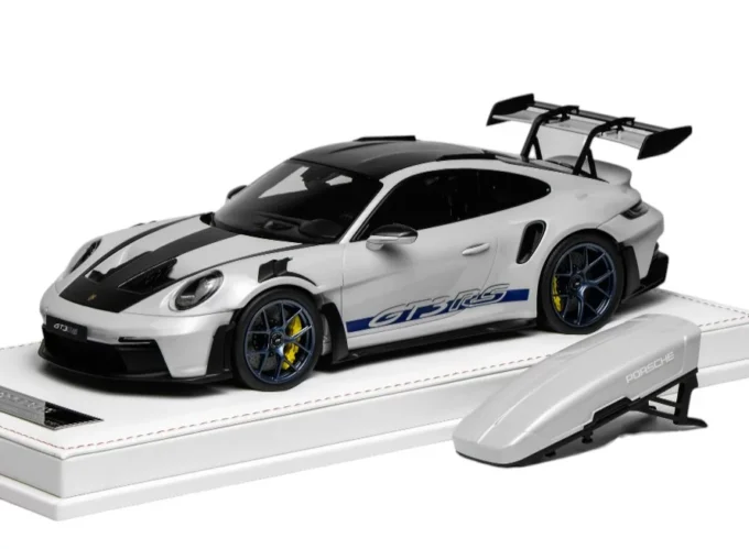 Cette Porsche 911 GT3 RS (992) à l'échelle 1:18 se pare d'un coloris Ice Grey Metallic avec bandes bleues, jantes bleues et coffre de toit amovible. Fabriquée en résine par IVY Model, elle est limitée à 25 exemplaires et livrée avec socle et vitrine.