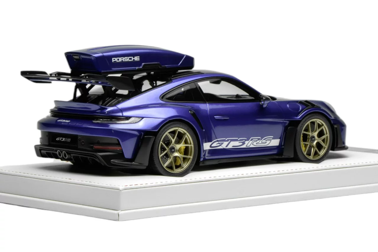 Cette Porsche 911 GT3 RS (992) à l'échelle 1:18 présente une teinte violette avec bandes blanches, jantes dorées et coffre de toit amovible. Cette miniature en résine IVY Model est limitée à 15 exemplaires et livrée avec socle et vitrine.