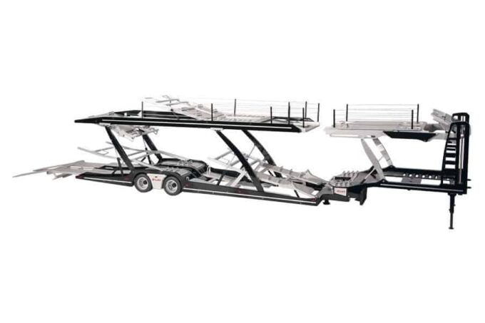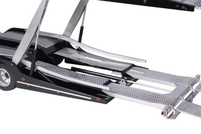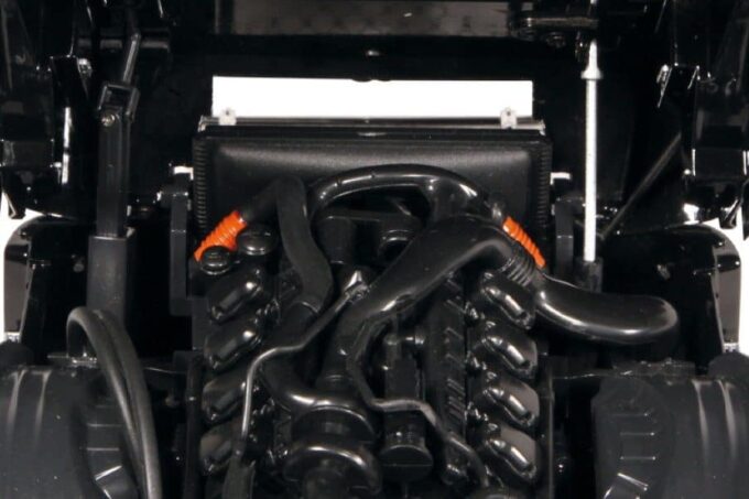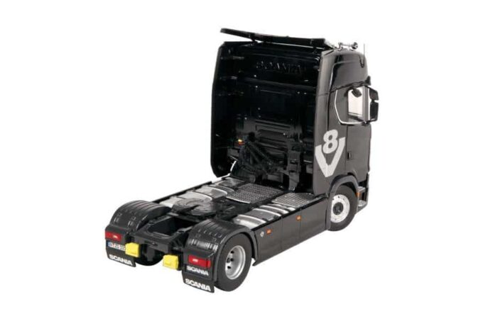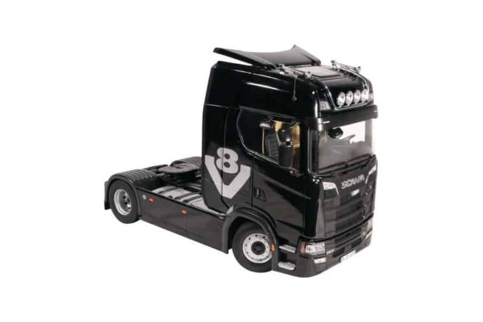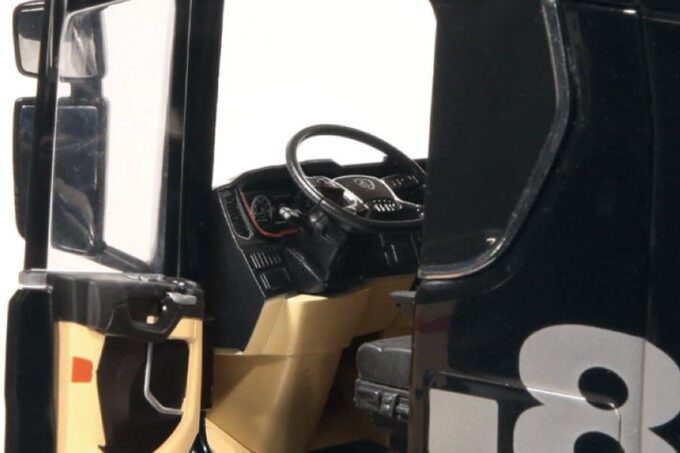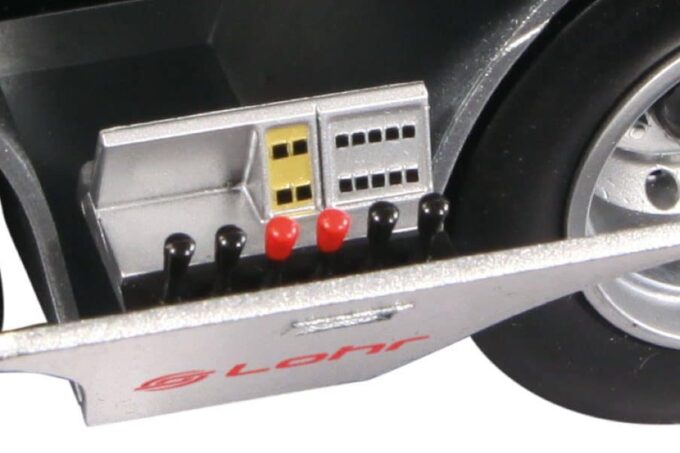 Faites de la place ! Ce magnifique camion Scania 720S noir accompagné de sa remorque porte-voitures Lohr à l’échelle 1:18 va vous éblouir : roues directionnelles, inclinaison de la cabine, moteur détaillé, rampe de chargement amovible… ce camion d’une longueur totale de près d’1.30m peut accueillir jusqu’à 6 voitures à l’échelle 1:18. Assurément la pièce maîtresse de votre collection !