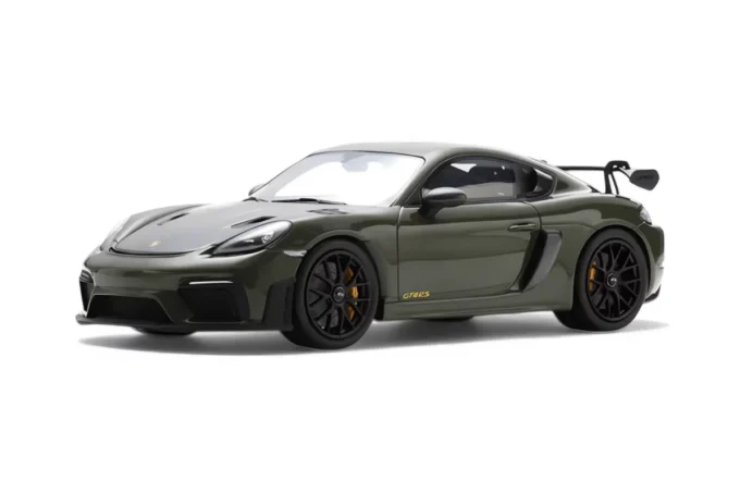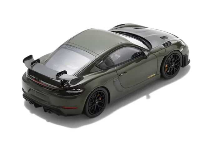 La Porsche 718 Cayman GT4 RS Weissach Package à l'échelle 1:18 dans un coloris Nato Olive distinctif est fabriquée en résine par Spark en série limitée. Livrée avec socle et vitrine, cette GT4 RS intègre le moteur flat-six de 4,0 litres atmosphérique de la GT3, délivrant 500 chevaux et capable d'atteindre 9000 tours par minute.