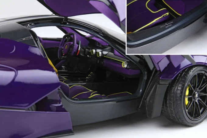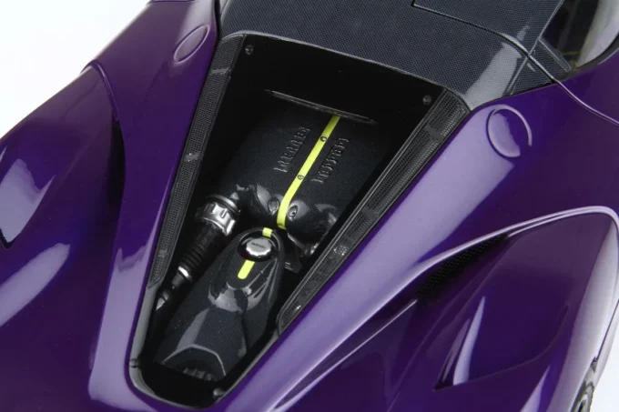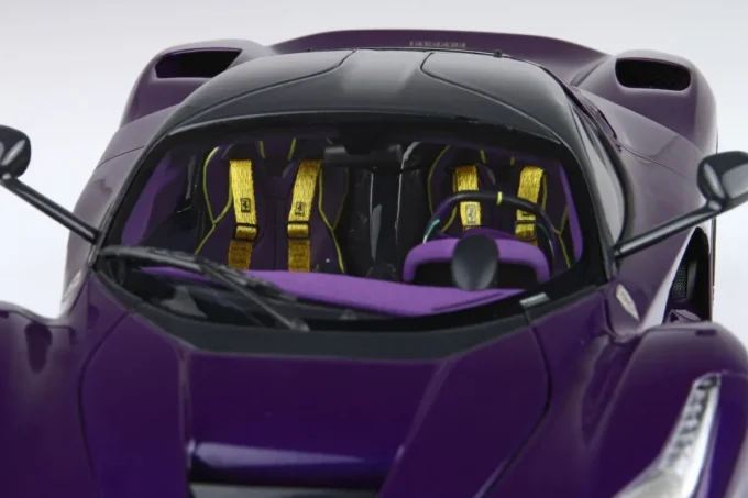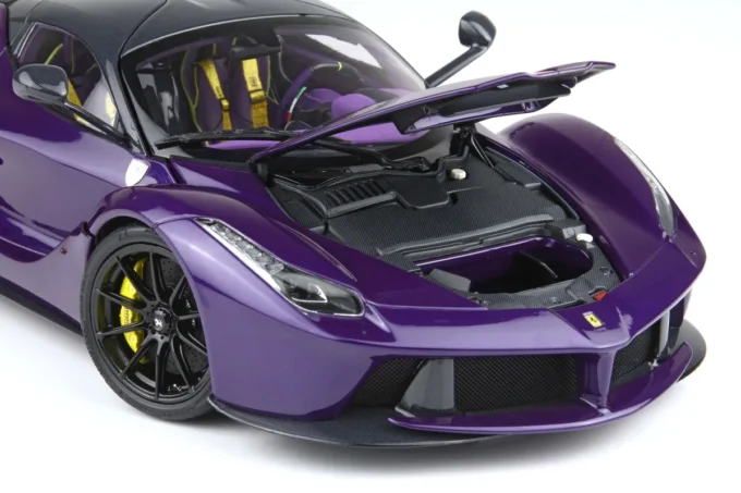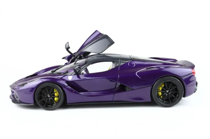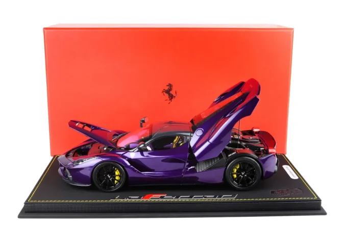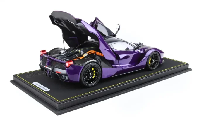 Cette voiture miniature à l'échelle 1:18 reproduit la Ferrari LaFerrari dans un coloris violet Dubai Viola Vio. Fabriquée par BBR en métal, cette miniature est produite en série limitée, possède des ouvrants et est livrée avec un socle et une vitrine. La base en simili-cuir est cousue à la main et la vitrine est fabriquée en Italie. La Ferrari LaFerrari est connue pour être la première supercar hybride de Ferrari.