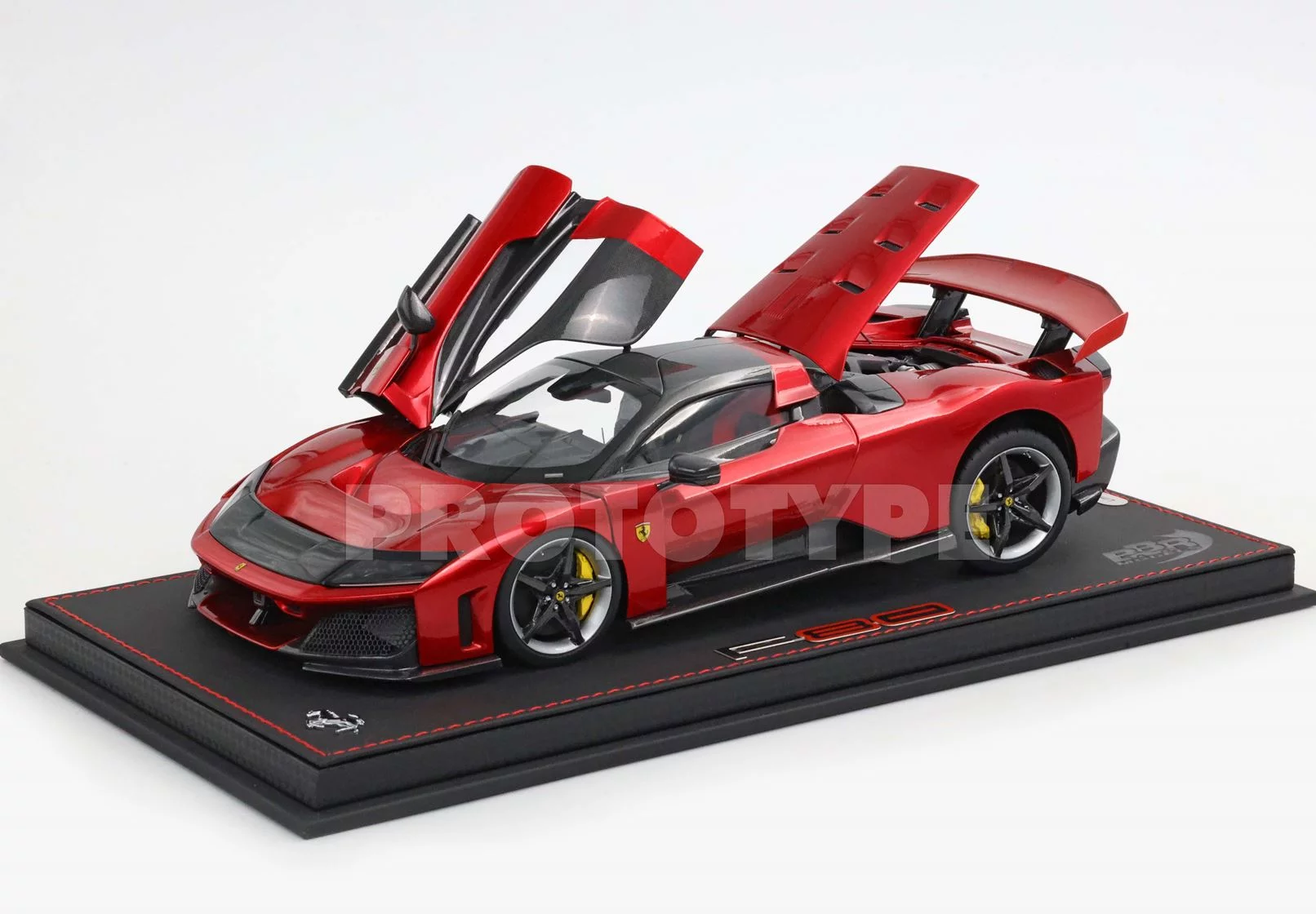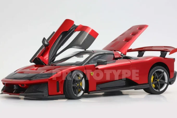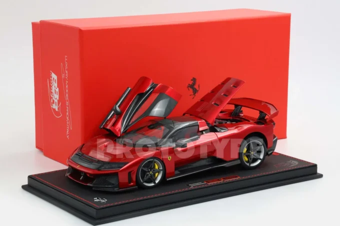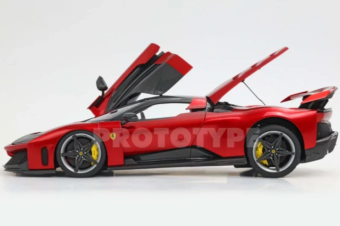 La Ferrari F80 à l'échelle 1:18 de BBR est réalisée en métal, parée de son rouge Supercar emblématique. Dotée d'ouvrants fonctionnels et présentée sous vitrine avec son socle, cette reproduction en série limitée célèbre l'hypercar la plus puissante jamais créée par Ferrari avec ses 1 200 chevaux. Cette F80 commémore les 80 ans du constructeur de Maranello et arbore un moteur V6 hybride dérivé de la 499P victorieuse aux 24 Heures du Mans, marquant une nouvelle ère pour le Cavallino Rampante.