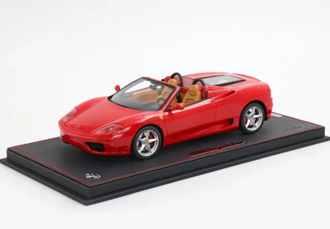 Cette Ferrari 360 Modena Spider à l'échelle 1:18 dans sa teinte Rosso Corsa avec intérieur beige repose sur un socle haut de gamme. Produite en résine par BBR en seulement 60 exemplaires, cette spider italienne arbore la légendaire couleur Rosso Corsa de Ferrari.