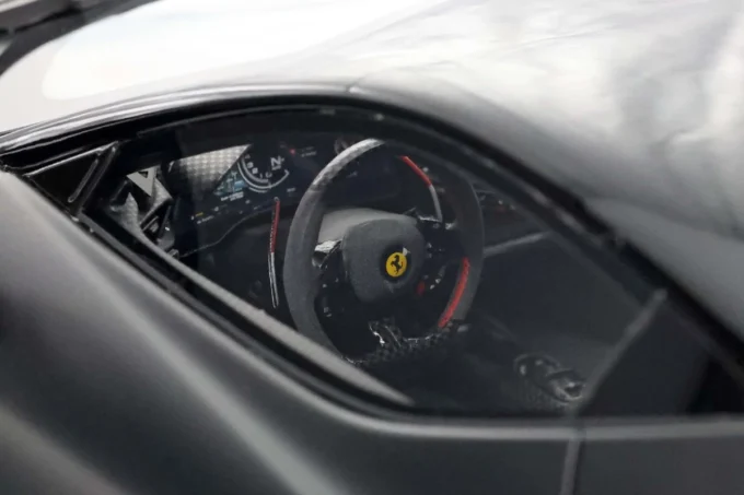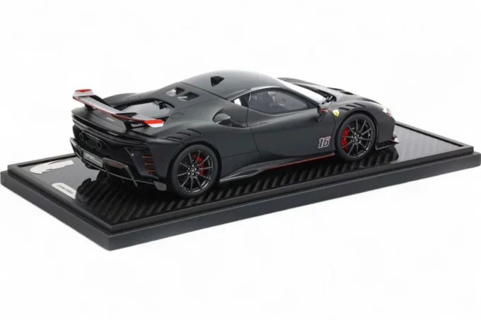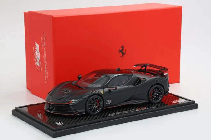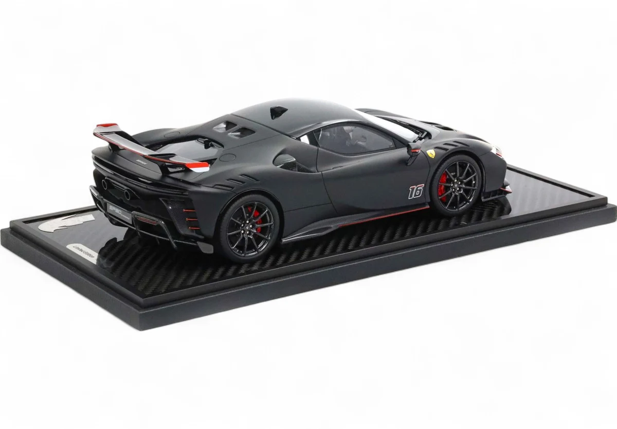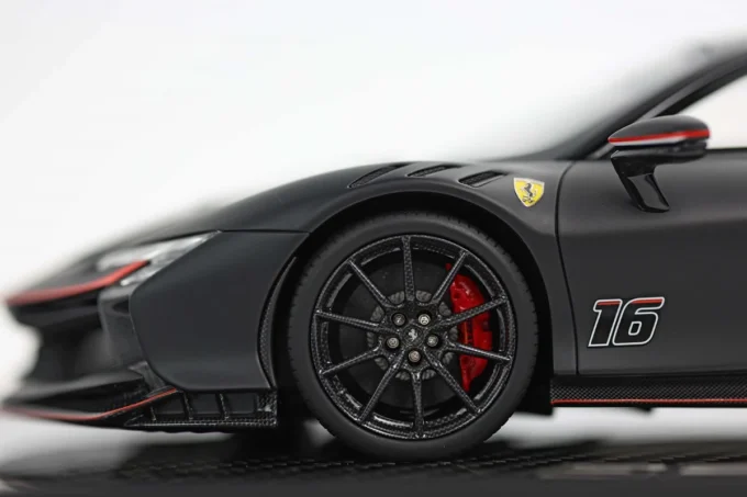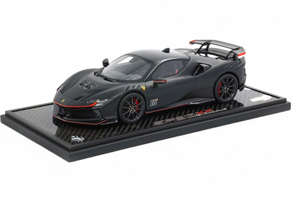 Cette Ferrari SF90 XX Stradale au numéro 16 à l'échelle 1:18 de teinte noire mate repose sur une base en véritable carbone. Édition limitée à seulement 20 exemplaires, ce modèle BBR en résine capture le bolide hybride le plus extrême jamais homologué sur route, capable de 1 030 chevaux.