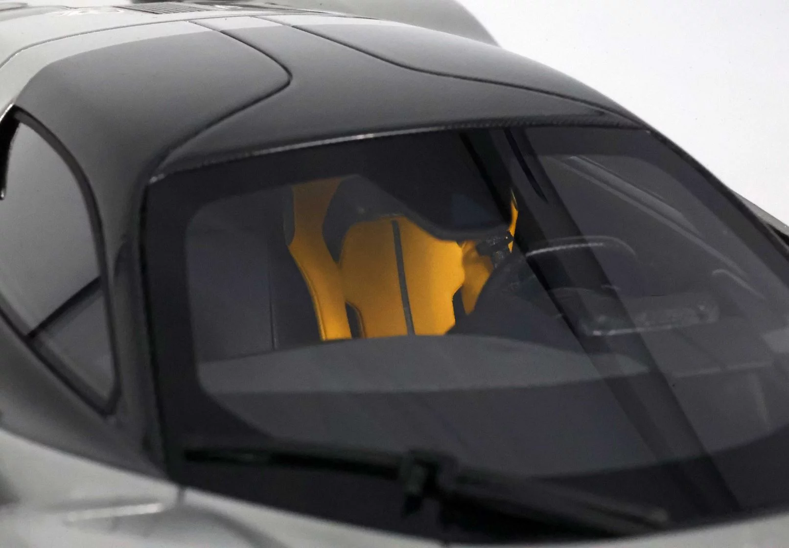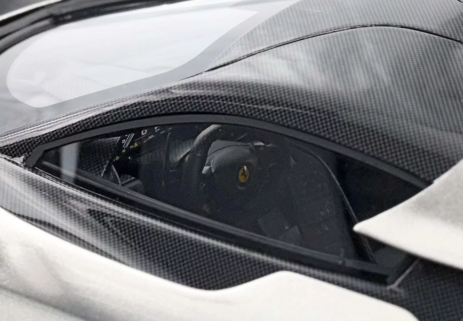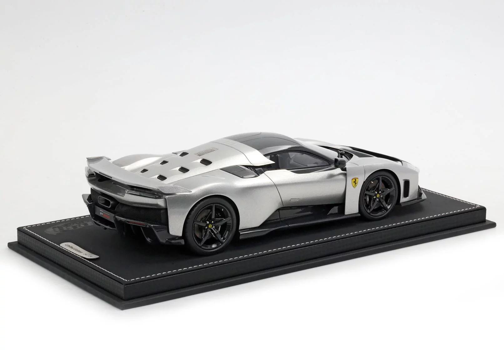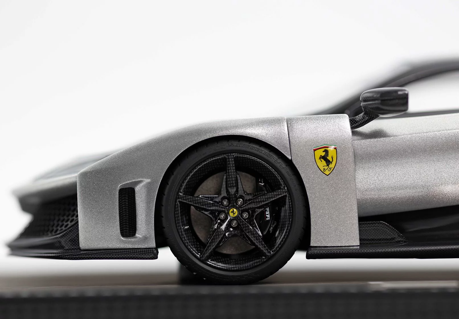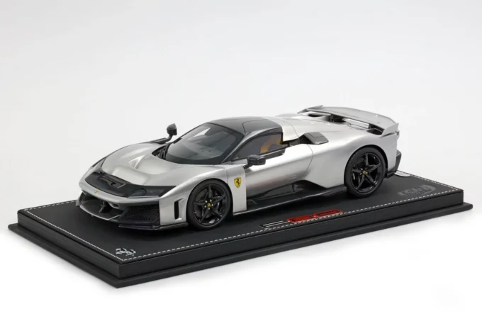 La Ferrari F80 en gris Aluminium de BBR, reproduite ici à l’échelle 1:18, se distingue par ses lignes puissantes et ses jantes en carbone qui accentuent son allure sportive. Fabriqué en résine et posé sur un socle, ce modèle en édition limitée incarne le raffinement futuriste que Ferrari imagine pour ses voitures de rêve.