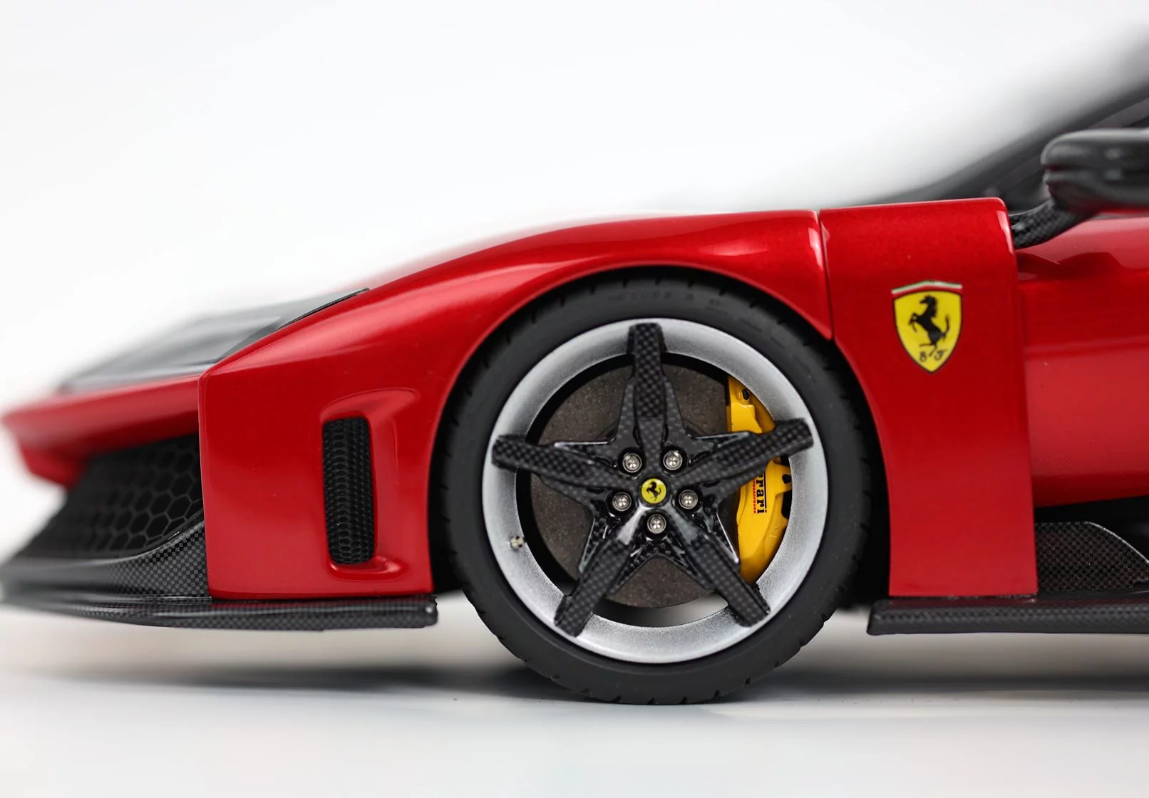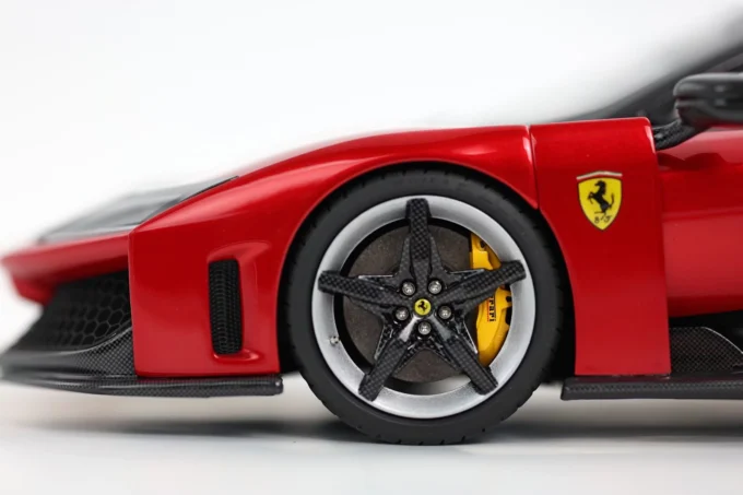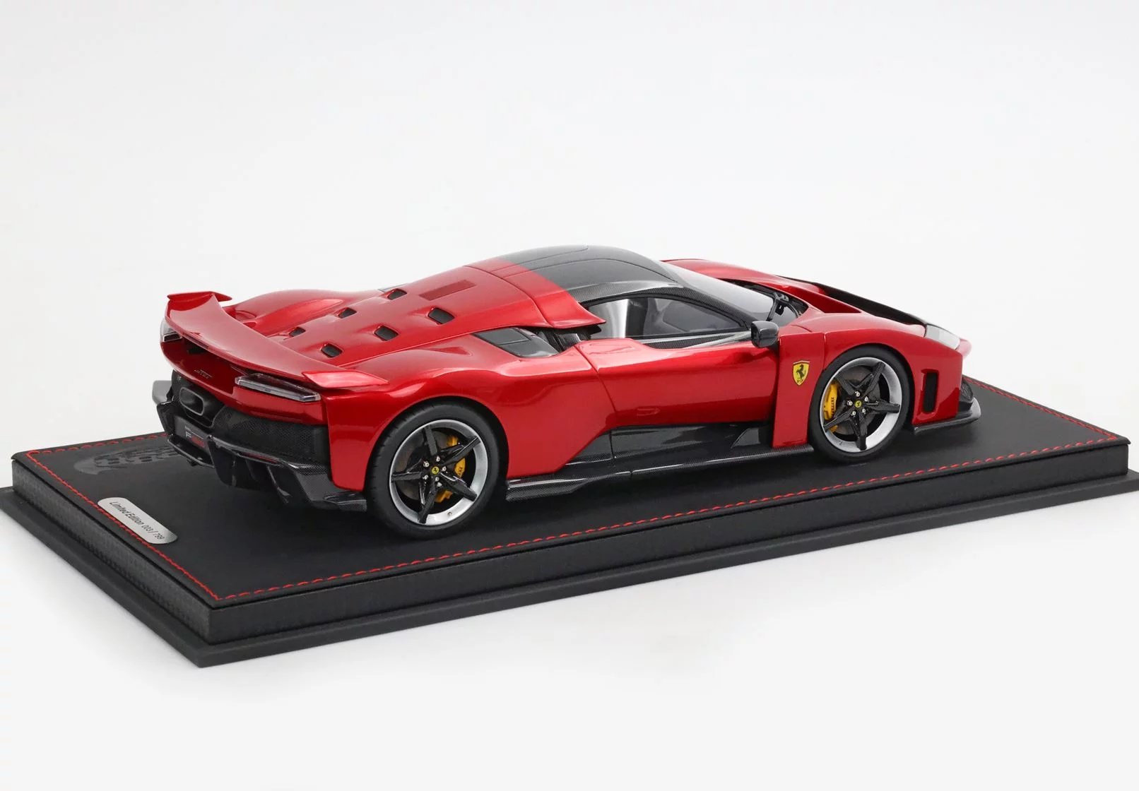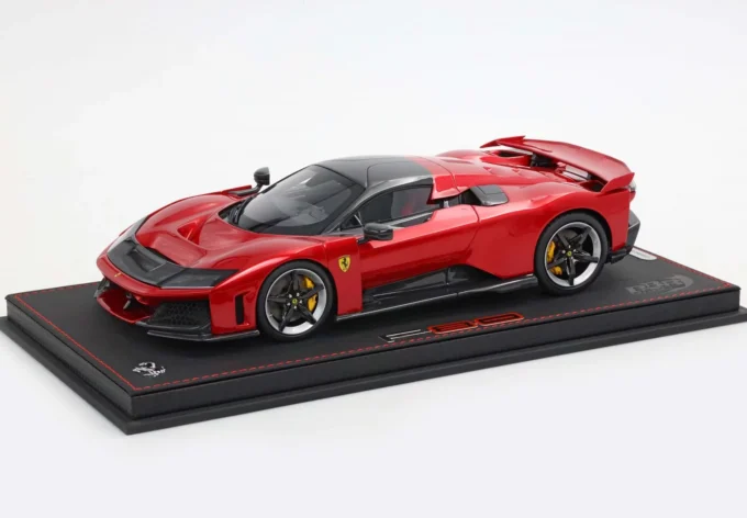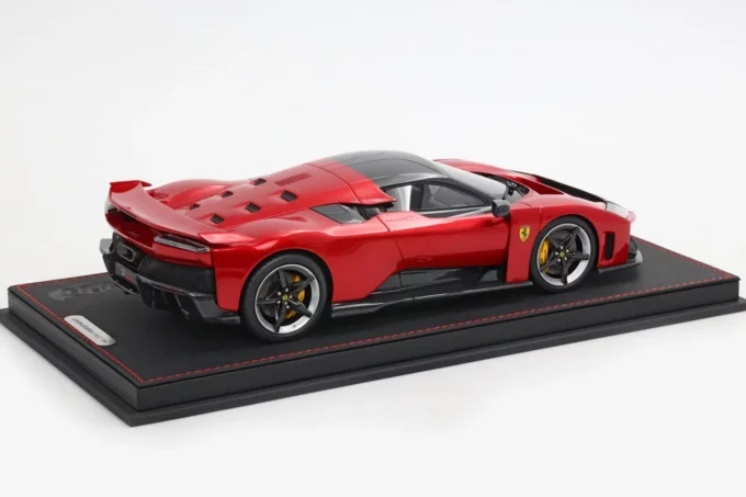 La Ferrari F80 à l’échelle 1:18, dans sa couleur rouge Supercar avec des jantes bi-ton argent/carbone, est fabriquée par BBR en résine. Cette supercar est une édition limitée et repose sur un socle. La Ferrari F80, prévue pour les 80 ans de la marque, combine une motorisation hybride avec une puissance totale de 1200 chevaux.