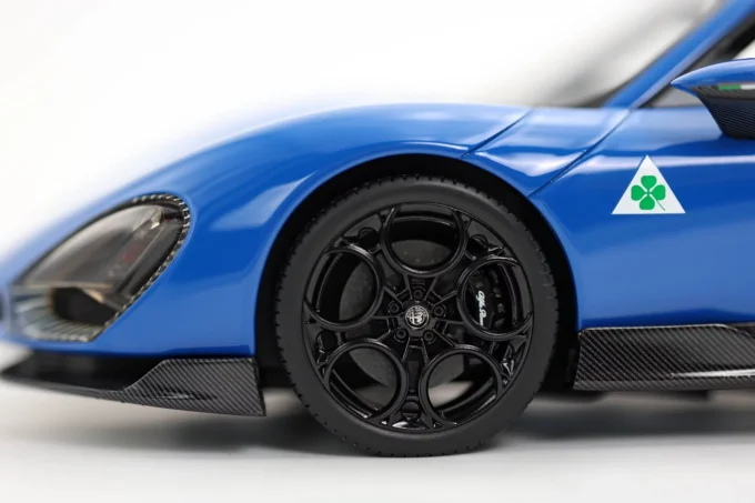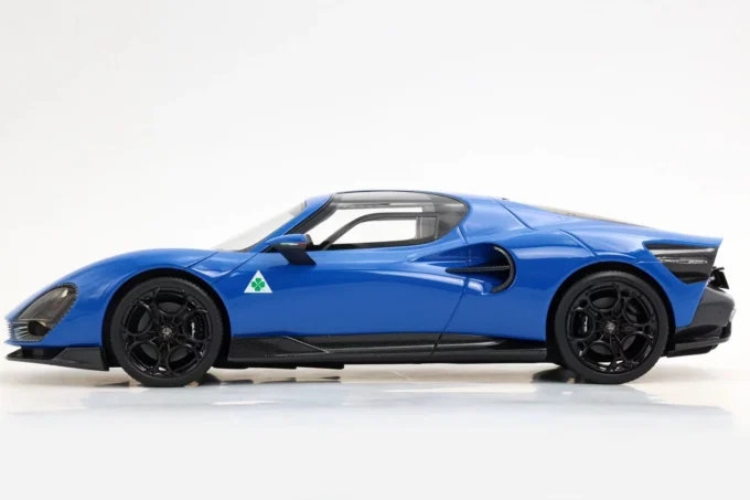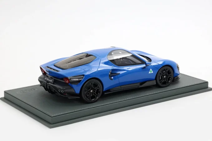 L'Alfa Romeo 33 Stradale à l'échelle 1:18 se distingue par sa teinte Blu reale et ses intérieurs noirs. Cette réalisation BBR en résine, accompagnée de son socle, témoigne de l'exclusivité absolue d'une voiture vendue près de 2 millions d'euros. Chaque propriétaire collabore directement avec les artisans de la "Bottega" Alfa Romeo pour personnaliser son exemplaire, transformant l'achat en véritable expérience créative.