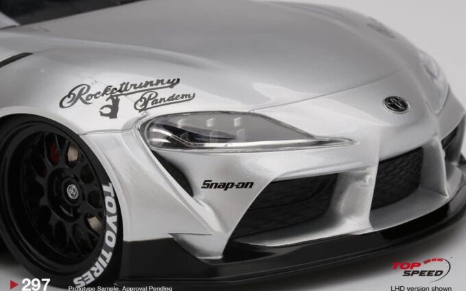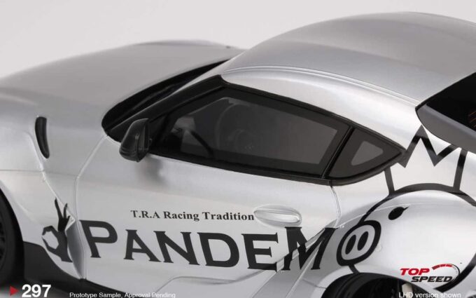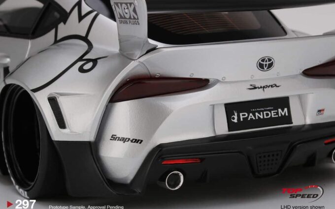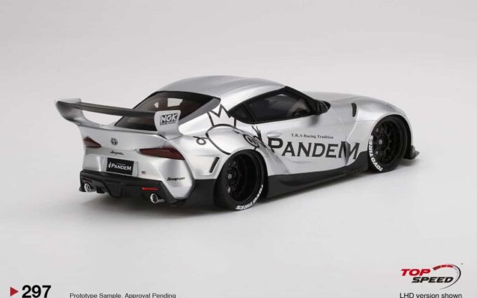 La Toyota Supra GR grise argentée est reproduite à l’échelle 1:18 dans une version widebody préparée par Pandem. Fabriquée par Top Speed, cette miniature de haute qualité est réalisée en résine.