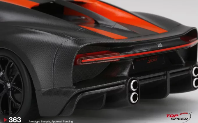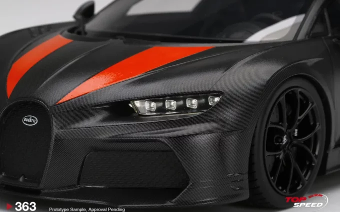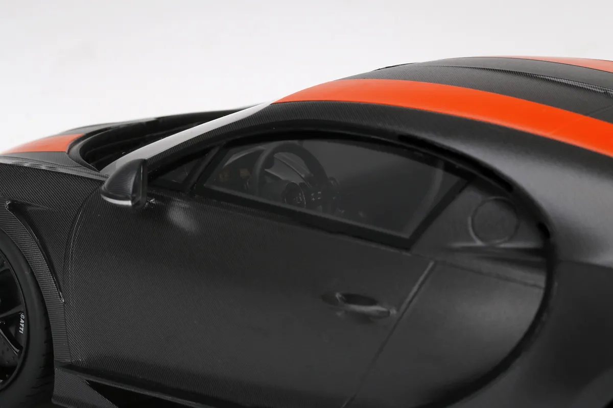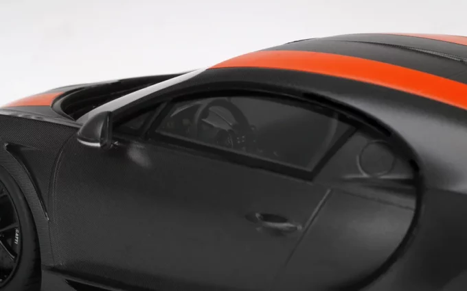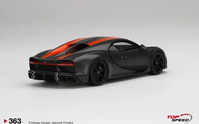 Cette voiture miniature à l'échelle 1:18ème reproduit la Bugatti Chiron Super Sport 300+ dans un coloris noir et bandes oranges. Fabriqué par TopSpeed, ce modèle réduit est réalisé en résine.